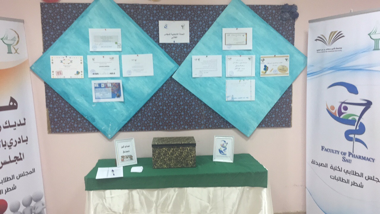 المجلس الطلابي الإستشاري بكلية الصيدلة شطر الطالبات يبدأ دورته الجديدة نظم المجلس الطلابي الإستشاري شطر الطالبات حملته الإنتخابية  لأعضائه الجدد  للعام الجامعي 1438ه وذلك  يومي الاحد والخميس الموافق ١٢-١٥/ ١ /١٤٣٨ حيث يحق لأي طالبة تنطبق عليها شروط المجلس ترشيح نفسها أو من تختار في عضوية المجلس ومن ثم يتم فرز الأصوات  واختيار الرئيسة والنائبة وبقية الأعضاء بآلية متفق عليها مسبقاً وقد بدأت عملية الاقتراع في تمام الساعة ٨ صباحا  حتى ١ ظهرا ،الجدير بالذكر ان المجلس الطلابي الإستشاري  له دور مهم في تعليم الطالبات كيف ينجحون في تواصلهم مع الآخرين، وكيف يعبرون عن أفكارهم بثقة وإقدام. بالإضافة الى  إشراك الطالبة في التخطيط والتنسيق والإعداد والتنظيم للفعاليات الجامعية والمجتمعية في جوانبها المختلفة كما يساهم في معالجة مشكلات الطالبة وإبداء الرأي حول الحلول المناسبة لها و تقديم  المقترحات الإيجابية