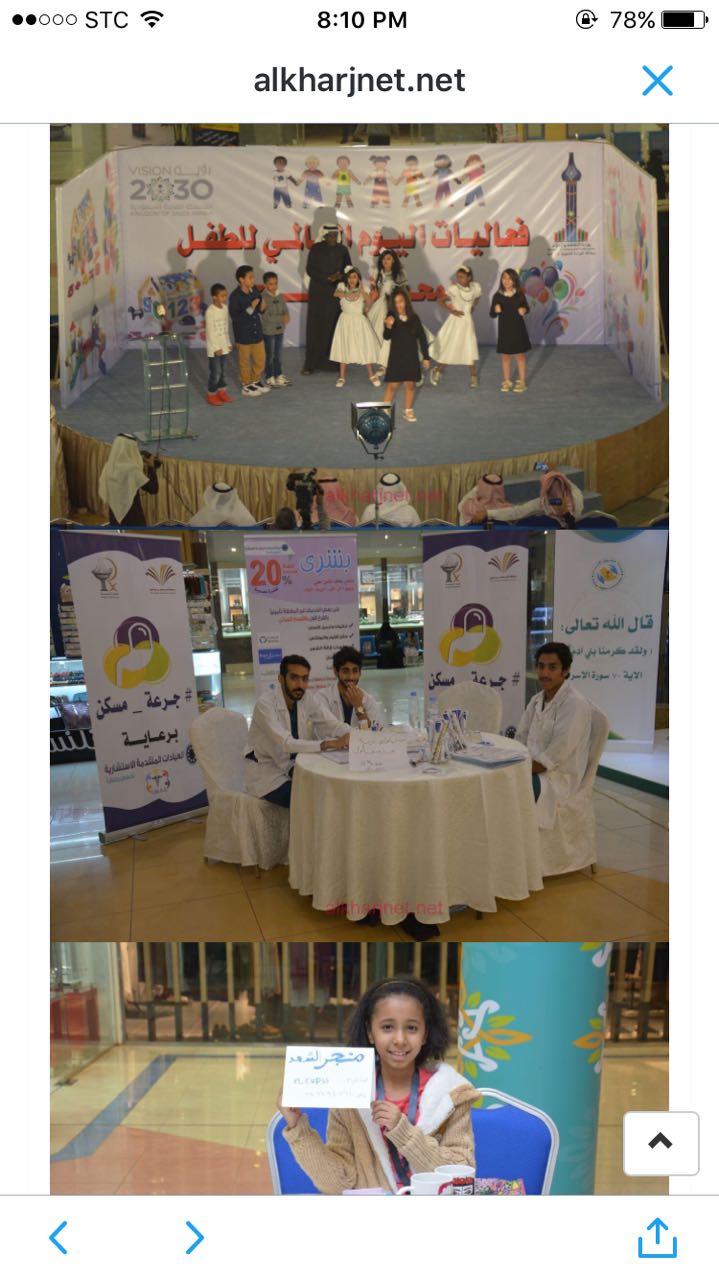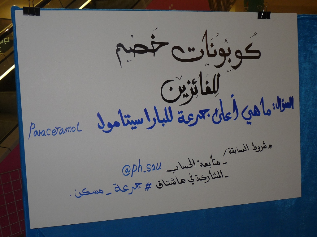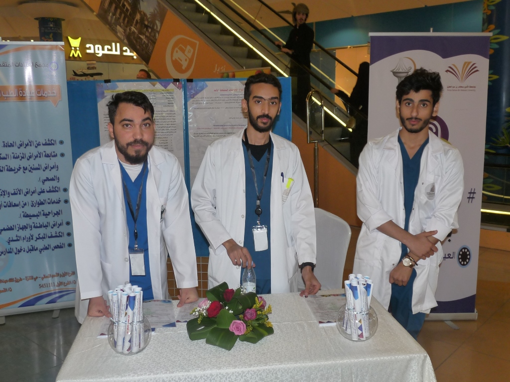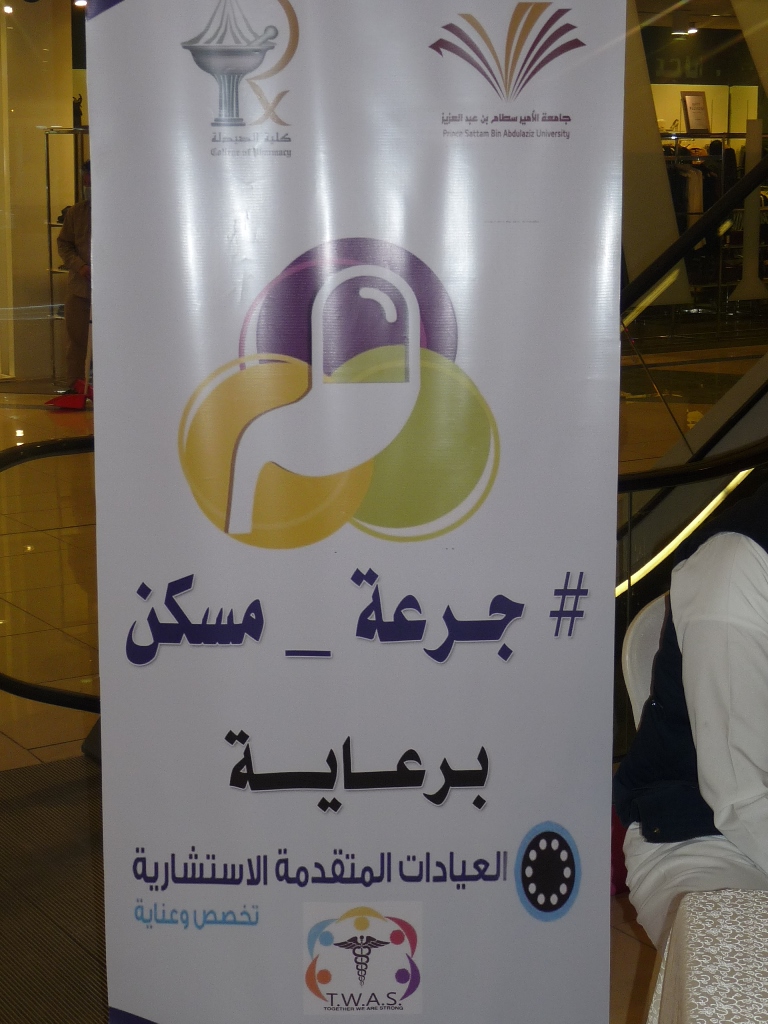 تحت رعاية سعادة عميد الكلية الدكتور فهد بن إبراهيم الصيخان واشراف سعادة وكيل الكلية للشئون التعليمية والأكاديمية الدكتور أحمد بن إبراهيم فوده اقامت الكلية فعالية بعنوان ( جرعة_مسكن ) والتى تهدف إلى توعية المجتمع باستخدام هذهِ المسكنات والتعامل معها حيث انه في ظلِّ انتشار الأخطاء الشائعة في التعامل مع المسكِّنات و أنواعها المختلفة،هناك حاجة ملحة لمثل هذه الفعاليات لرفع الثقافة الصحية لدى المجتمع. وقد أُقيمت هذهِ الفعالية يوم الخميس 24/2 /١٤٣٨هـ الموافق 24/11/2016م في مجمع الحديثي بالخرج، ونظرا للإقبال الشديد على الفعالية طلب منا مشاركة وزارة الإعلام الاحتفال بيوم الطفل على مدار اليومين التاليين (الجمعة والسبت 25-26 /2/١٤٣٨هـ) بنفس الفعالية فى نفس المكان واستجابت الكلية نظرا لحاجة المجتمع لمثل هذهِ الفعاليات ، و إيماناً منا بأهمية التوعية الإجتماعية . وشارك فى الفعالية طلاب الكلية ومنهم ممثلين لمجموعة تواس ودعم الفعالية مجموعة العيادات المتقدمة الأستشارية وبمشاركة الدكتور منشاوى عزمى منشاوى المشرف على الأنشطة الطلابية والمحاضر نهاد جاسر عن اعضاء هيئة التدريس وكان على راس الطلاب المشاركين الطلاب الأتى اسماؤهم:
