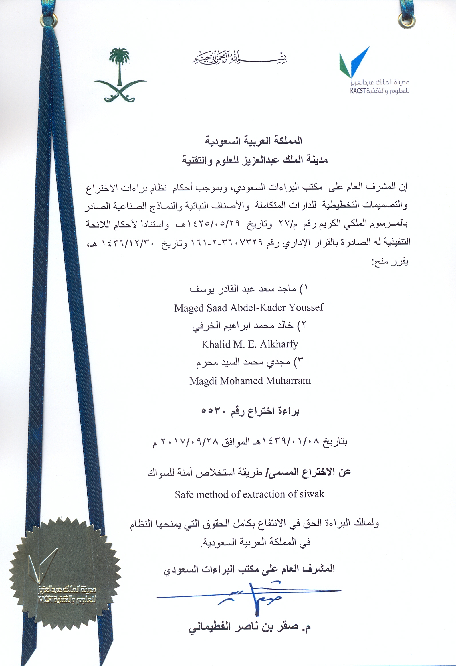 في إنجاز جديد لكلية الصيدلة بجامعه الامير سطام بن عبدالعزيز حصل كل من الأستاذ الدكتور ماجد سعد عبدالقادر والأستاذ الدكتور خالد بن محمد الخرفي والأستاذ الدكتور مجدي السيد محرم على براءة اخترع رقم 5530 بمسمى طريقة استخلاص آمنة للسواك بتاريخ 8/1/1439هـ الموافق 28/9/2017م حيث أن المشرف العام على مكتب البراءات السعودي وبموجب أحكام نظام براءات الاختراع والتصميمات التخطيطية للدراسات المتكاملة والأصناف النباتية والنماذج الصناعية الصادر بالمرسوم الملكي الكريم رقم م/27 وتاريخ 29/5/1425هـ، واستنادا لأحكام اللائحة التنفيذية له الصادرة بالقرار الإداري رقم 3607329-2-161 وتاريخ 30/12/1436هـ يقرر منح: 1- ماجد سعد عبدالقادر يوسف 2- خالد محمد إبراهيم الخرفي 3- مجدي محمد السيد محرم براءة اختراع رقم 5530 بتاريخ 8/1/1439هـ الموافق 28/9/2017م عن الاختراع المسمى/ طريقة استخلاص آمنة للسواك – ولمالك البراءة الحق في الانتفاع بكامل الحقوق التي يمنحها النظام في المملكة العربية السعودية.