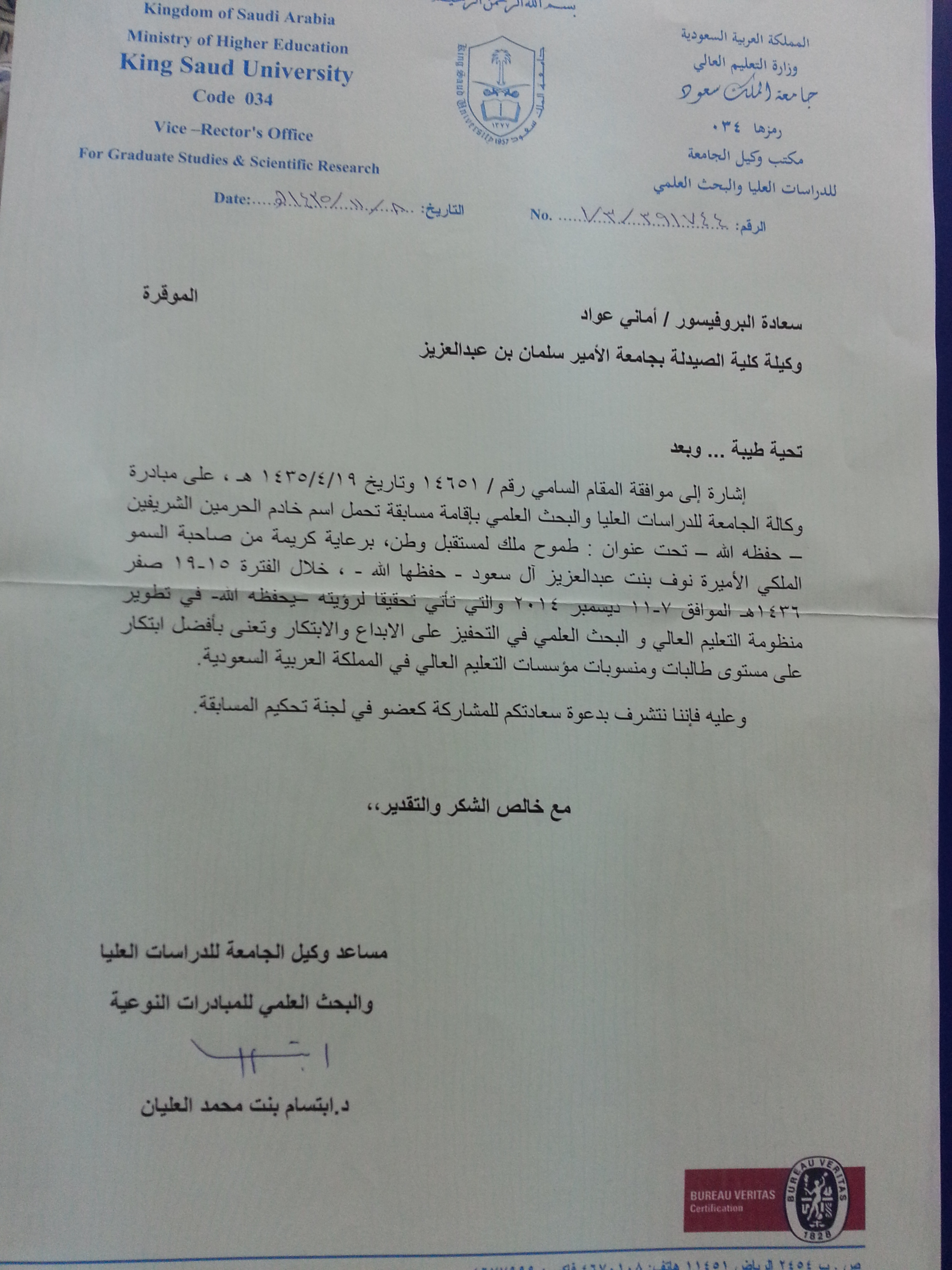 إيماناً بدور جامعة سلمان بن عبد العزيز في منظومة التعليم الجامعي وتفعيلاً للاستفادة من خبرات عضوات هيئة التدريس في هذه الجامعة الفتيه تلقت الأستاذة الدكتورة أماني عواد استاذ العقاقير ووكيلة كلية الصيدلة فرع الطالبات بجامعة سلمان دعوة للانضمام إلى عضوية لجنة التحكيم فى مسابقة (طموح ملك لمستقبل وطن) وقد وجهت الدعوة لها سعادة الدكتورة ابتسام العليان مساعد وكيل الجامعة للدراسات العليا والبحث العلمي للمبادرات النوعية بجامعة الملك سعود. هذا والجدير بالذكر ان هذه المسابقة تحمل اسم خادم الحرمين الشريفين حفظه الله بعد موافقة المقام السامي وتأتى تحقيقاً لرؤيته - يحفظه الله- في تطوير منظومة التعليم العالي والبحث العلمي في التحفيز على الابداع والابتكار وتعنى بأفضل ابتكار على مستوى طالبات ومنسوبات مؤسسات التعليم العالي في المملكة. هذا وقد اتت هذه المسابقة بناء على مبادرة وكالة الجامعة للدراسات العليا والبحث العلمي بجامعة الملك سعود.