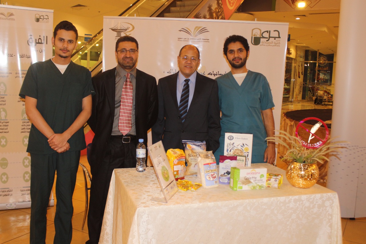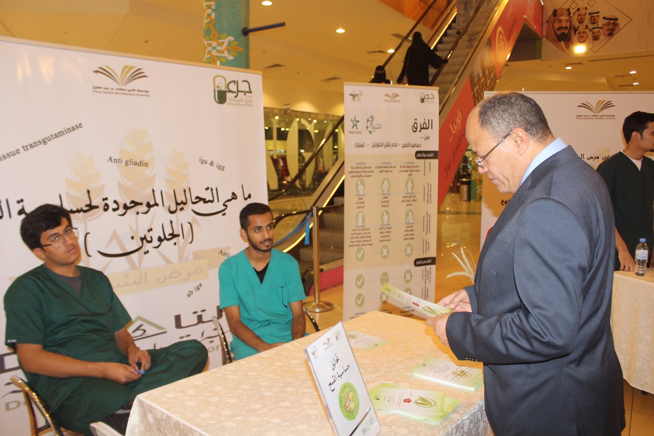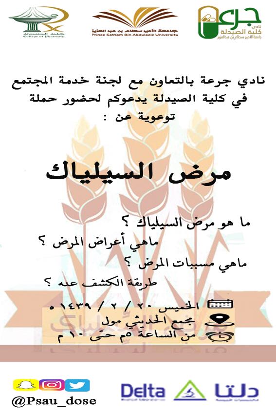 تحت رعاية سعادة الدكتور فهد بن إبراهيم الصيخان عميد الكلية أقامت لجنة الأنشطة الطلابية برئاسة الدكتور أحمد بن إبراهيم فودة وكيل الكلية للشؤون الأكاديمية والتعليمية وعضوية كل من الدكتور أحمد العليوى مشرف نادى جرعة والدكتور منشاوى عزمى مشرف الأنشطة الطلابية بالتعاون مع لجنة خدمة المجتمع برئاسة الدكتور عبدالله الفيفى رئيس اللجنة وتمثيل كل من الدكتور جمال جبر والمحاضر نهاد جاسر يوم الخميس 20/2/1439هـ الموافق 9/11/2017م فعالية لتوعية أهالى مدينة الخرج بمرض السيلياك (حساسية القمح) أعراضه وكيفية اكتشافه والتعامل معه في حال اكتشافه والأغذية التي يجب على المريض تناوله وما يجب تجنبه وعدم تناوله حتى يحيا حياة صحيه سليمة ولاقت الفعالية نجاحا كبيرا حيث زارها كثير من الرواد من كافة الأطياف وكان رد فعلهم شاكرا لمجهودات الطلاب في خدمة وطنهم وأبناء ديرتهم في التعريف بالجوانب الصحية التي قد تخفى عليهم ولفت انتباهم من أجل رعاية أفضل لأسرهم وقد شارك في الفعالية عدد من طلاب الكلية وهم: