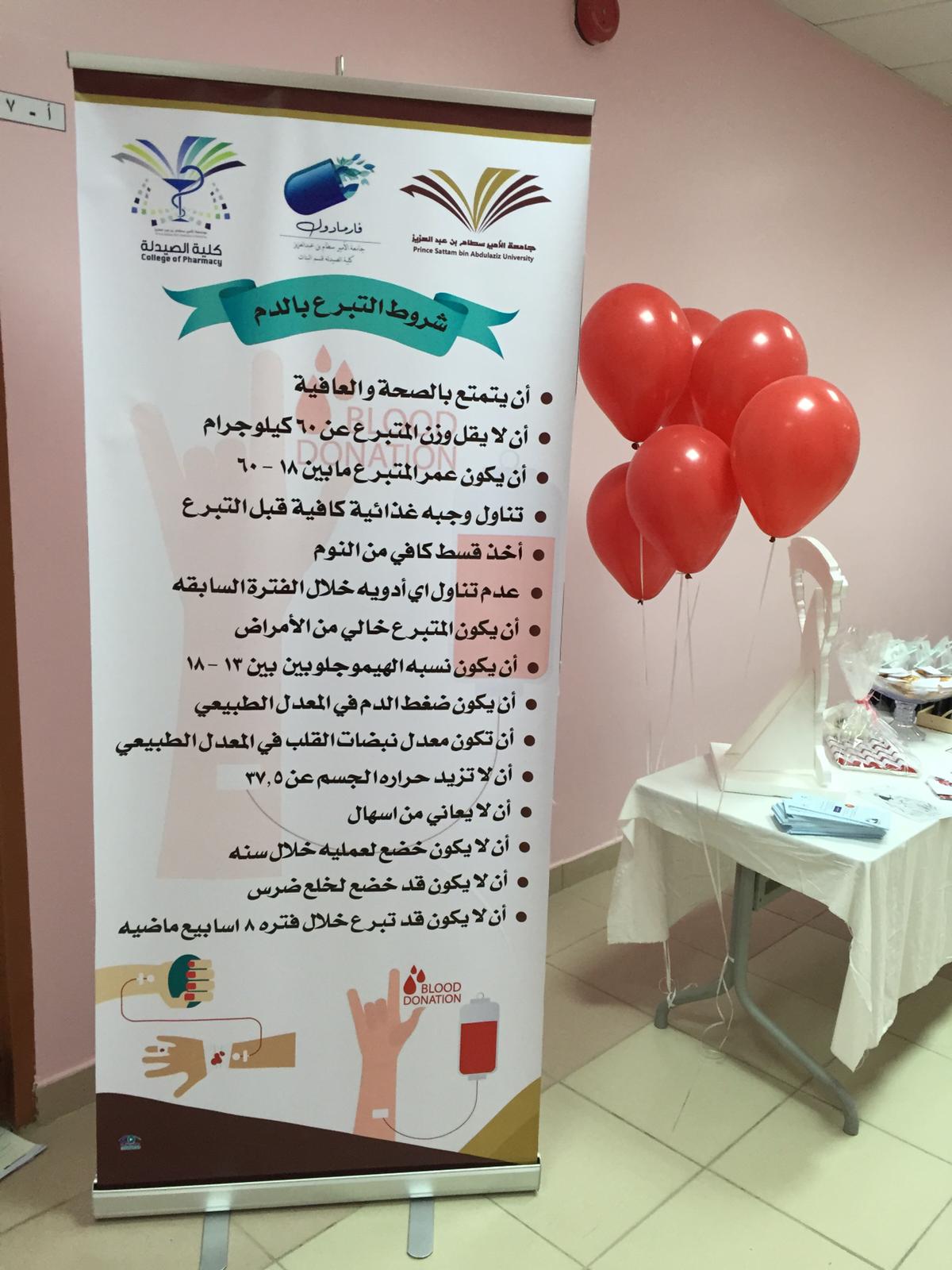 نظم قسم الكيمياء الصيدلية بكلية الصيدلة حملة تبرع بالدم بالتعاون مع بنك الدم بمستشفى الملك خالد بالخرج بهدف ترسيخ ثقافة التطوع في نفوس الطالبات وتشجيع روح المبادرة لديهن حيث يعتبر التبرع بالدم عمل انساني نبيل يساهم في انقاذ حياة المرضى و في الوقت نفسه لا يسبب ضررا على صحة ا لمتبرع بل يعود عليه بفوائد عديده, حيث قام بنك الدم بمستشفى الملك خالد ممثلة بالدكتورة شمامه هاجيف بتوفير المكان المناسب و المريح للمتبرعين و جميع مستلزمات سحب الدم بطريقة صحية داخل الكلية ، و قد شاركت طالبات المستوى الثالث بركن تميز بتنوع المنشورات التشجيعية للتبرع بالدم و بالفوائد العائدة على المتبرع و بعض الهدايا التحفيزية للمتبرعين , و كانت لمشاركة نادي فارمادول الطلابي بركن الإفطار دور كبير في تعزيز صحة المتبرع قبل و بعد تبرعه بالدم. كما شهدت الفعالية اقبال كبير من عضوات هيئة التدريس و طالبات كلية الصيدلة و كذلك طالبات كلية المجتمع .