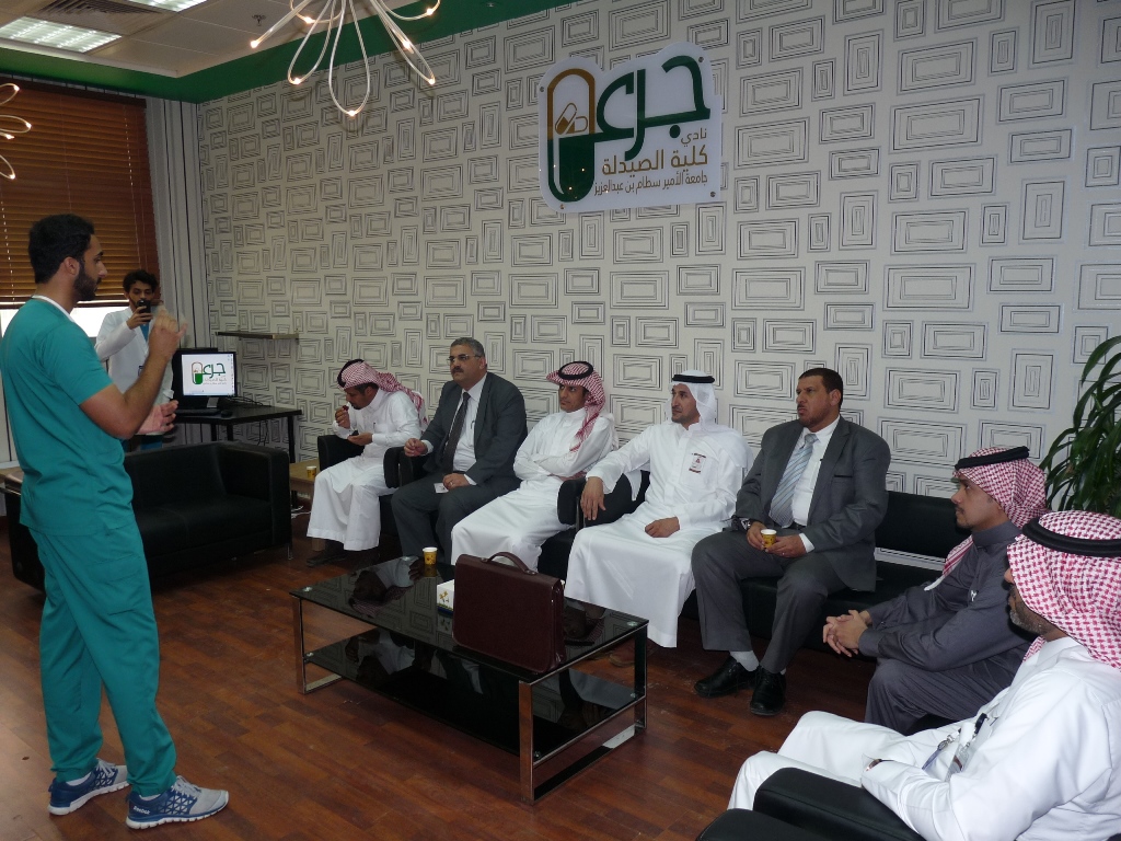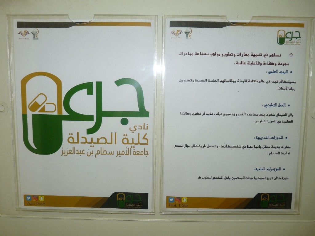 كتبه - عبدالعزيز القرناس / بحضور عميد كلية الصيدلة الدكتور فهد بن إبراهيم الصيخان والمندوب الممثل عن عمادة شؤون الطلاب الدكتور عبدالله بن سعود الشتيلي والدكتور أحمد بن سليمان العليوي مشرف نادي جرعة الطلابي إفتتحت كلية الصيدلة بجامعة الأمير سطام بن عبدالعزيز "نادي جرعة" منبر الإبداع الصيدلاني والذي يعتبر نادياً مهماً لاكتشاف وتطوير وتنمية مواهب الطلاب الرياضية والثقافية والاجتماعية والعمل على رعاية تشجيع الابتكار والإبداع لديهم وتعزيز انتمائهم وولائهم للجامعة وذلك يوم الأحد الموافق 6 / 6 / 1438هـ.