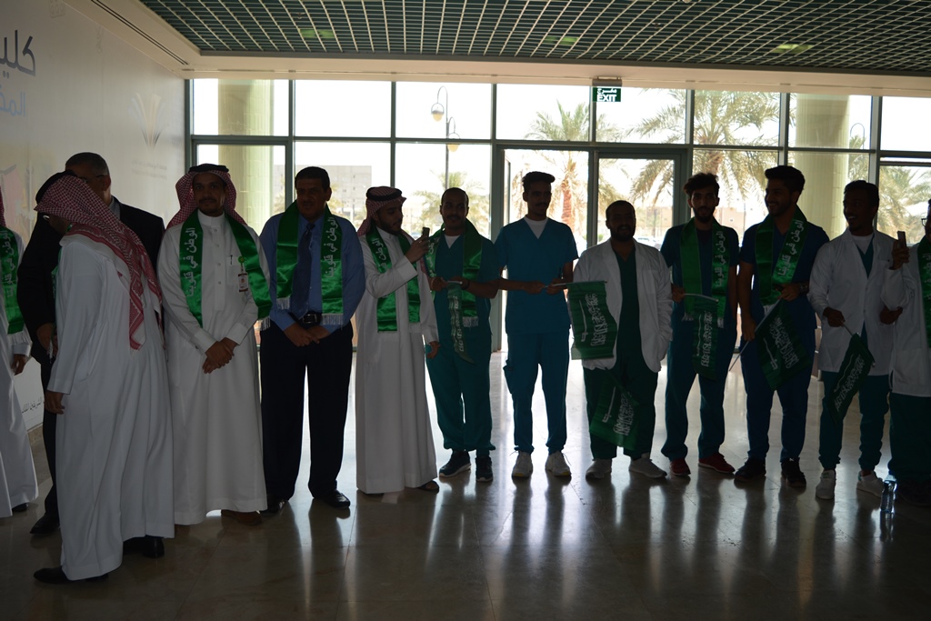بدأ الحفل بالسلام الملكي بعد ذلك ألقى سعادة عميد الكلية الدكتور أحمد بن سليمان العليوي كلمته عبر فيها عن مناسبة ذكرى الوطن وتوحيده على يد جلالة الملك عبدالعزيز بن عبدالرحمن طيب الله ثراه وما تعيشه المملكة العربية السعودية من أمن واستقرار في ظل الجهود الكبيرة من ولاة أمرنا وأنها ذكرى تاريخية يسعد بها جميع الشعب وستظل عالقة وخالدة في أذهان جميع أبناء هذا الوطن وأضاف فنحمد الله على ما تعيشه مملكتنا من تقدم وتطور وإزدهار وأختتم كلمته أن يوفق ولاة أمرنا لكل خير لهذه البلاد وأن يديم علينا الأمن والأمان وان يحفظ بلادنا من كل مكروه.
