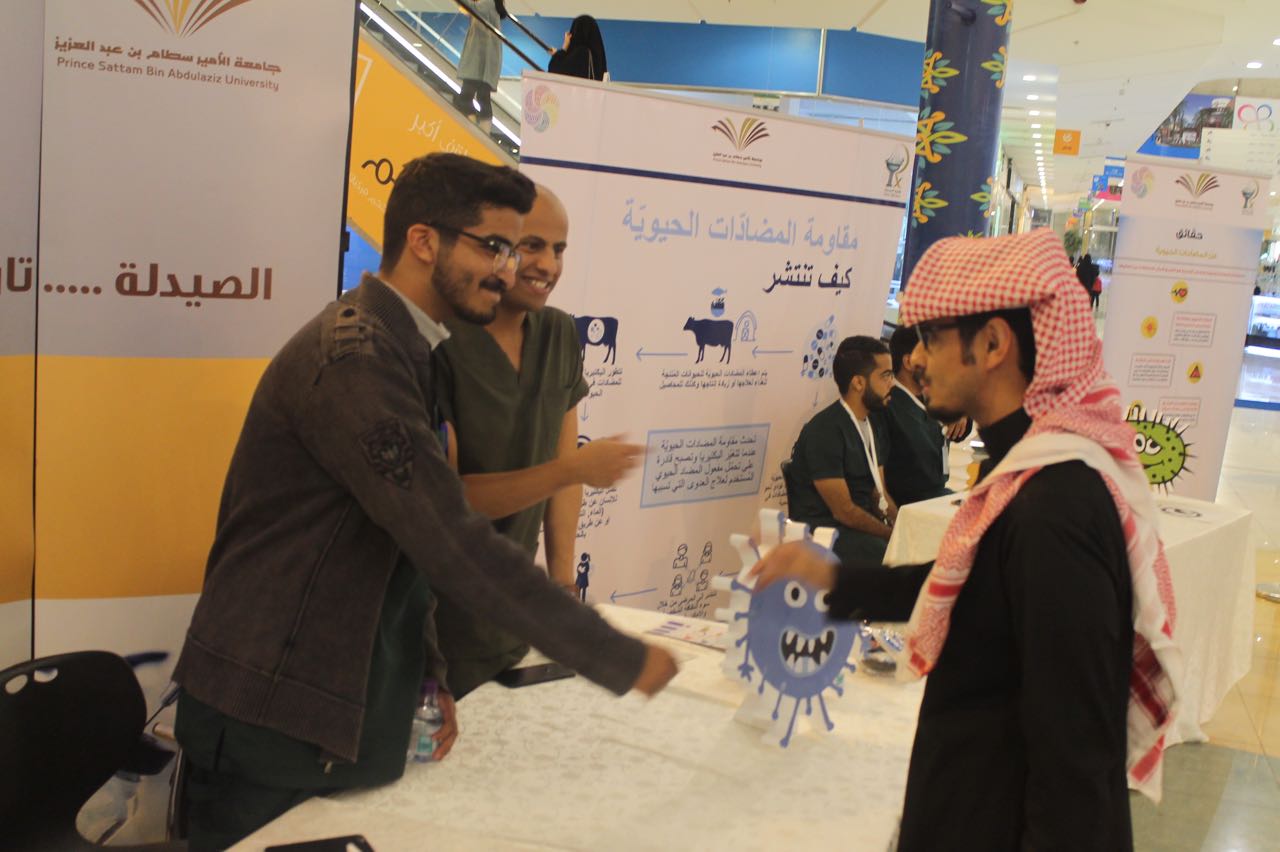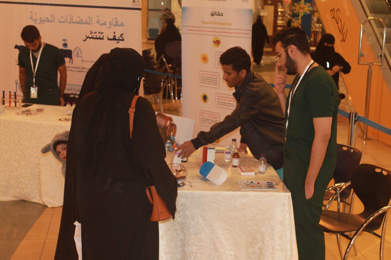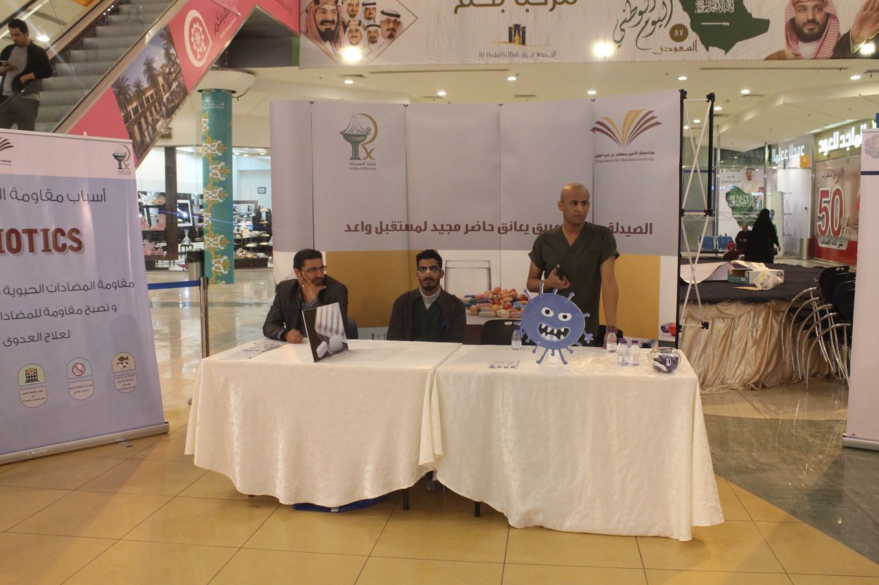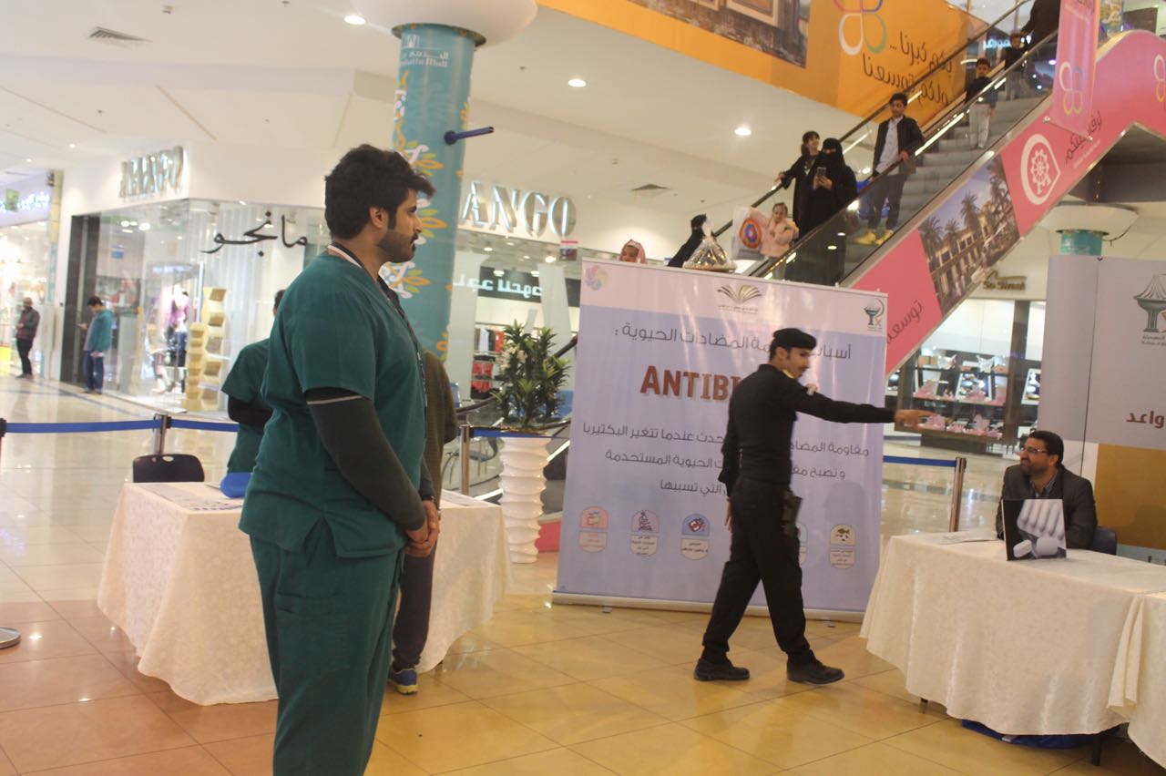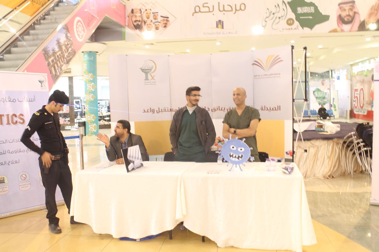 تحت رعاية عميد الكلية الدكتور فهد بن ابراهيم الصيخان أقامت وحدة الأنشطة الطلابية برئاسة الدكتور احمد فودة وكيل الكلية للشؤن الأكاديمية والتعليمية وعضوية كل من الدكتور أحمد العليوي مشرف نادى جرعة والدكتور منشاوي محمد مشرف الأنشطة الطلابية بالتعاون مع لجنة خدمة المجتمع برئاسة الدكتور عبدالله الفيفي وتمثيل المحاضر نهاد جاسر فعالية المضادات الحيوية بالحديثي مول في يوم السبت الموافق 21/3/1439هـ  وذلك ايمانا منها بأهمية دور طلاب الصيدلة في خدمة مجتمعهم حيث اقام طلاب المجلس الطلابي الفعالية    حيث قام الطلبة  بشرح الفرق بين الألتهاب الفيروسي والبكتيري لتعريف الزائرين الفرق بينهما وكيفية التعامل مع كل منهما والأستخدام الأمثل للمضادات الحيوية حتى لا تحدث المقاومة البكتيرية  واعتمد الطلاب فى توصيل المعلومة على الفيديوهات والصور بالإضافة الى المجسمات الحية وحرصوا على وجود ركن خاص بالطفل داخل المعرض وشارك في الفعالية العديد من الطلاب وهم: خالد العتيبي – عبدالرحمن الشهيل- زياد الدعجاني- مشاري عواض الرشيدي- خالد ناصر الشهراني- محمد خالد الغزواني- عبد الحكيم محمد الطاسان- مشاري ناصر الجعيدي- عبدالإله محمد الشهراني
