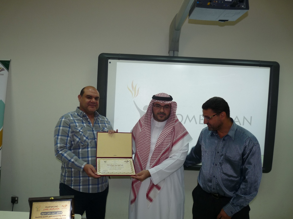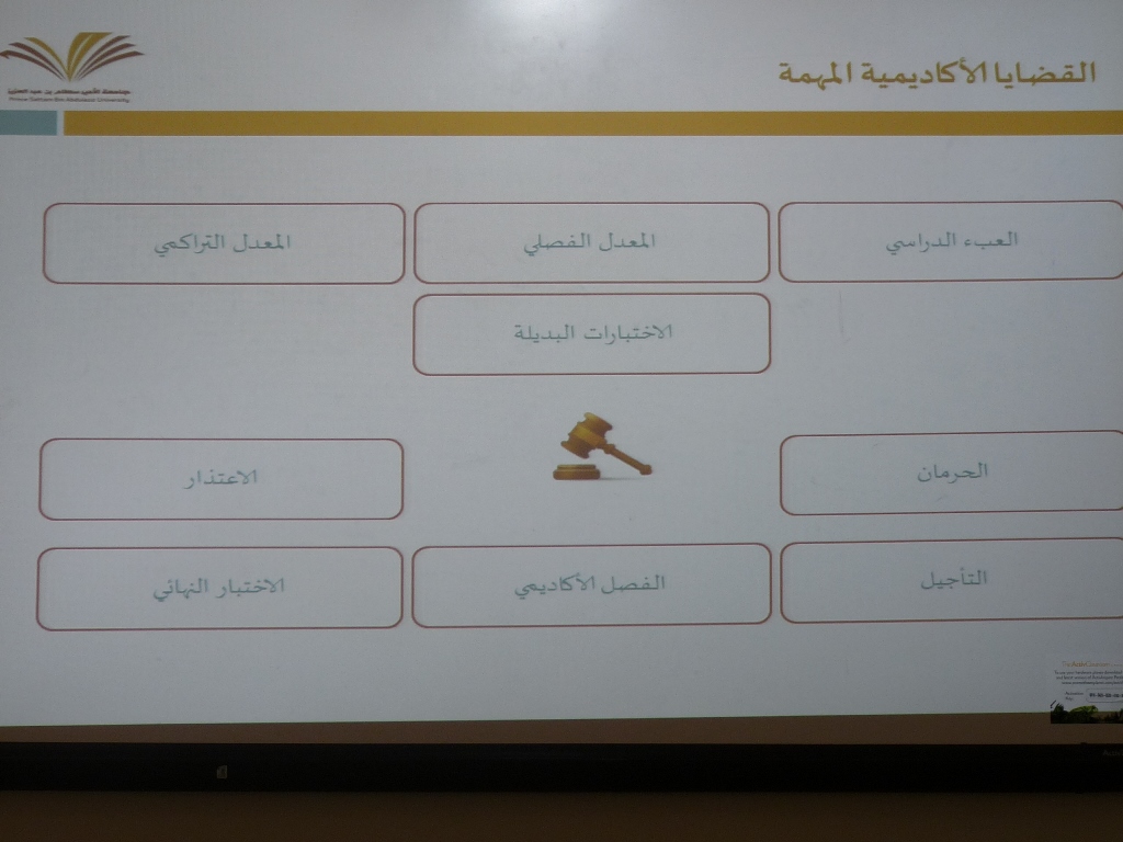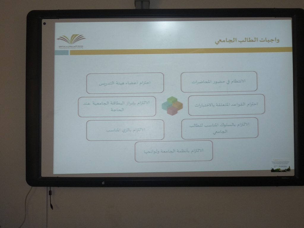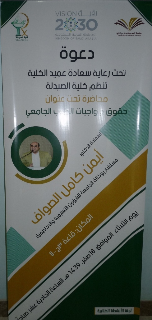 كتبه - عبدالعزيز القرناس / تحت رعاية عميد الكلية الدكتور فهد بن إبراهيم الصيخان نظمت لجنة الارشاد والحقوق الطلابية بالكلية برئاسة الدكتور أحمد بن إبراهيم فوده وكيل الكلية للشؤون التعليمية والأكاديمية محاضرة تحت عنوان: ( حقوق وواجبات الطالب الجامعي ) لسعادة الدكتور أيمن كامل الصواف مستشار وكالة الجامعة للشؤون التعليمية والأكاديمية وذلك يوم الثلاثاء الموافق 18 / 2 / 1439هـ بتمام الساعة الحادية عشر صباحاً بقاعة 3 - ج - 7 . حيث تطرقت المحاضرة إلى وجوب إحترام الجامعة كمؤسسة تعليمية وإحترام القائمين عليها، على نحو يبرز الشعور بالإنتماء ولا يجوز للطالب أن يأتي بأمرا يسئ لسمعة الجامعة في أي مكان أو زمان إضافة للسعي إلى النجاح والتفوق والاستفادة مما توفره الجامعة من فرص للتعليم والتعلم والتميز على الصعيد الأكاديمي والنشاط الطلابي . ونوه الدكتور أيمن كامل الصواف الطلاب بضرورة الالتزام بقانون الجامعة ونظمها الأساسية ولوائحها كما قام خلال المحاضرة بتوعية الطلاب وتثقيفهم بحقوقهم وواجباتهم داخل الجامعة إضافة إلى شرح كامل عن حقوق الطلاب بما يتوافق مع أنظمة الجامعة ولوائحها. وفي نهاية المحاضرة كرم سعادة وكيل الكلية للشؤون التعليمية والأكاديمية الدكتور أحمد بن إبراهيم فودة الدكتور أيمن كامل الصواف بدرع وشهادة شكر وتقدير نظير تلبيته الدعوة متمنين له دوام السعادة والتوفيق.