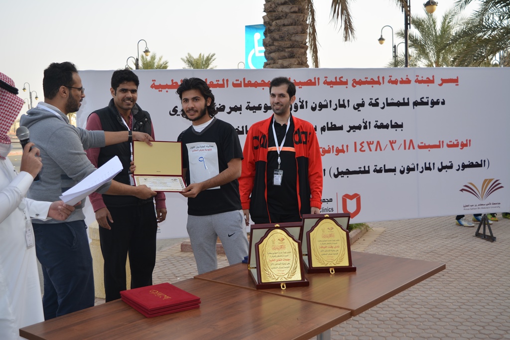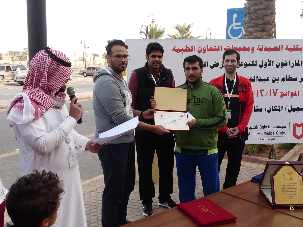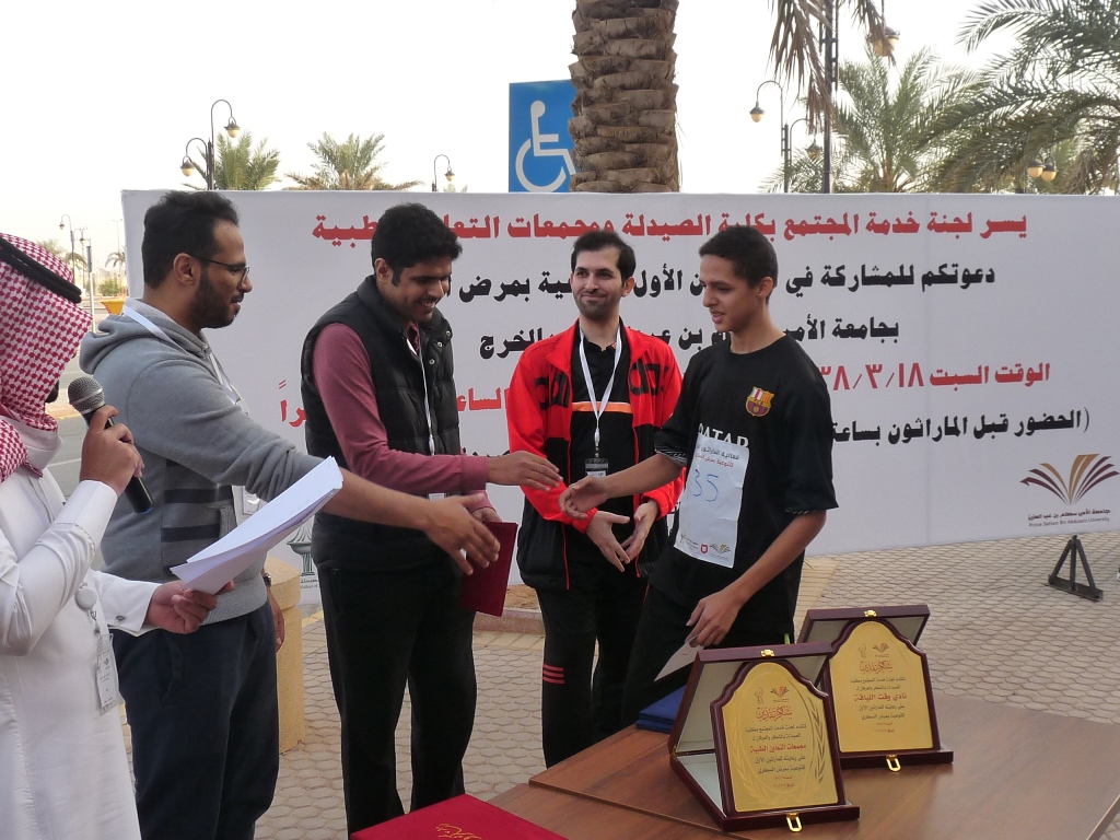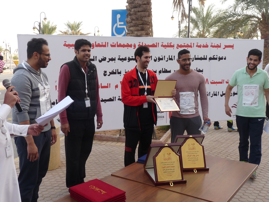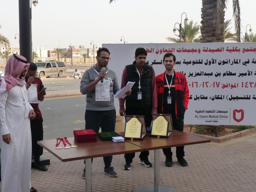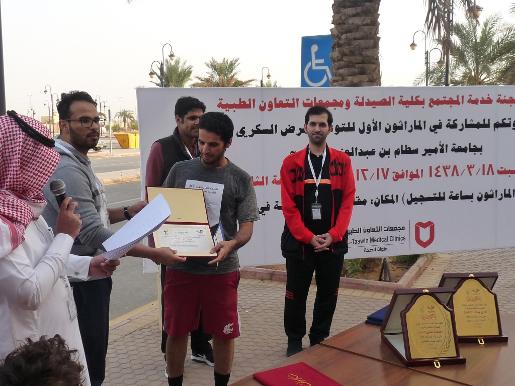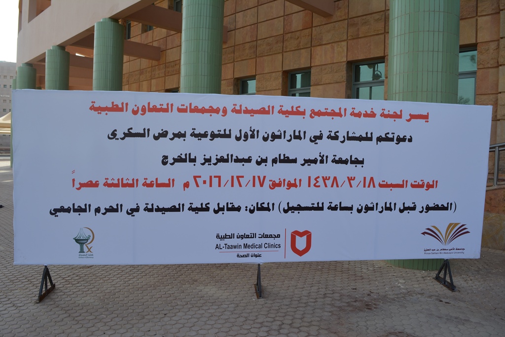 نظمت لجنة خدمة المجتمع بكلية الصيدلة في جامعة الامير سطام بن عبد العزيز فعالية الماراثون الأول للتوعية بمرض السكري برعاية كلاً من مجمعات التعاون الطبي ونادي وقت اللياقة في عصر يوم السبت 19/3/1438هـ الموافق 17/12/2016م. شارك في الحفل عدد كبير من مجتمع محافظة الخرج ومنسوبي جامعة الامير سطام بن عبد العزيز. تراوحت اعمار المشاركين ما بين 4 سنوات الى 60 سنة. وتخلل الفعالية قياس مستوى سكر الدم للمشاركين وتوزيع منشورات توعوية عن مرض السكري. وفي نهاية الحفل قام اعضاء لجنة خدمة المجتمع ( بحضور رئيس اللجنة سعادة الدكتور خالد بن مفلح الحارثي والأعضاء سعادة الدكتور فيصل بن فايح البقمي وسعادة الدكتور منشاوي عزمي منشاوي وسعادة الدكتور بدر بن بادي السليس وسعادة المحاضر عبدالله بن ترحيب المطيري ) بتوزيع الميداليات والعديد من الجوائز للفائزين بالماراثون وهم كالتالي: