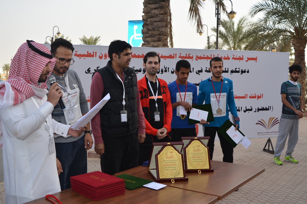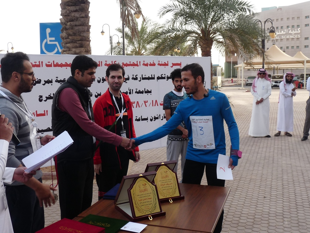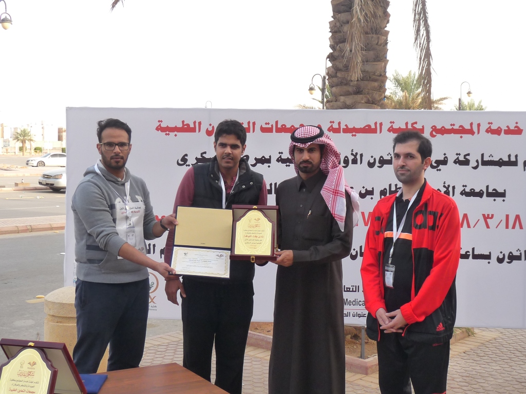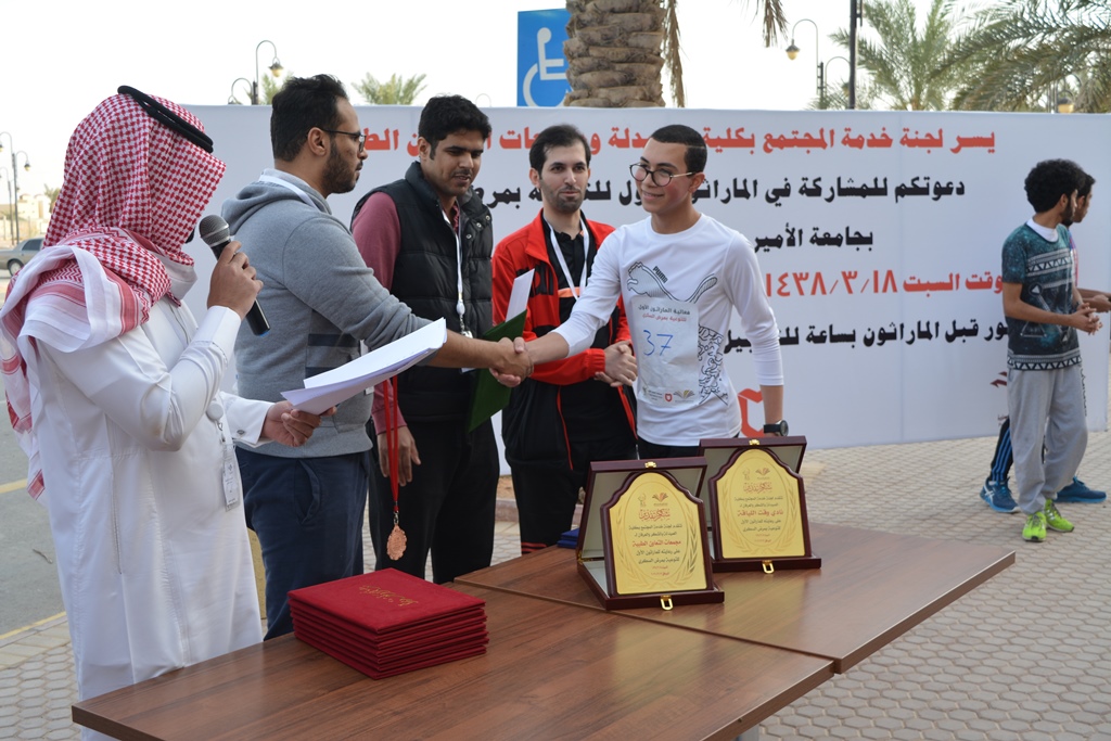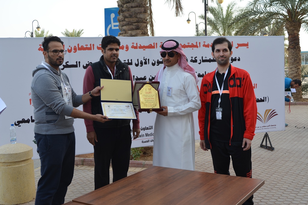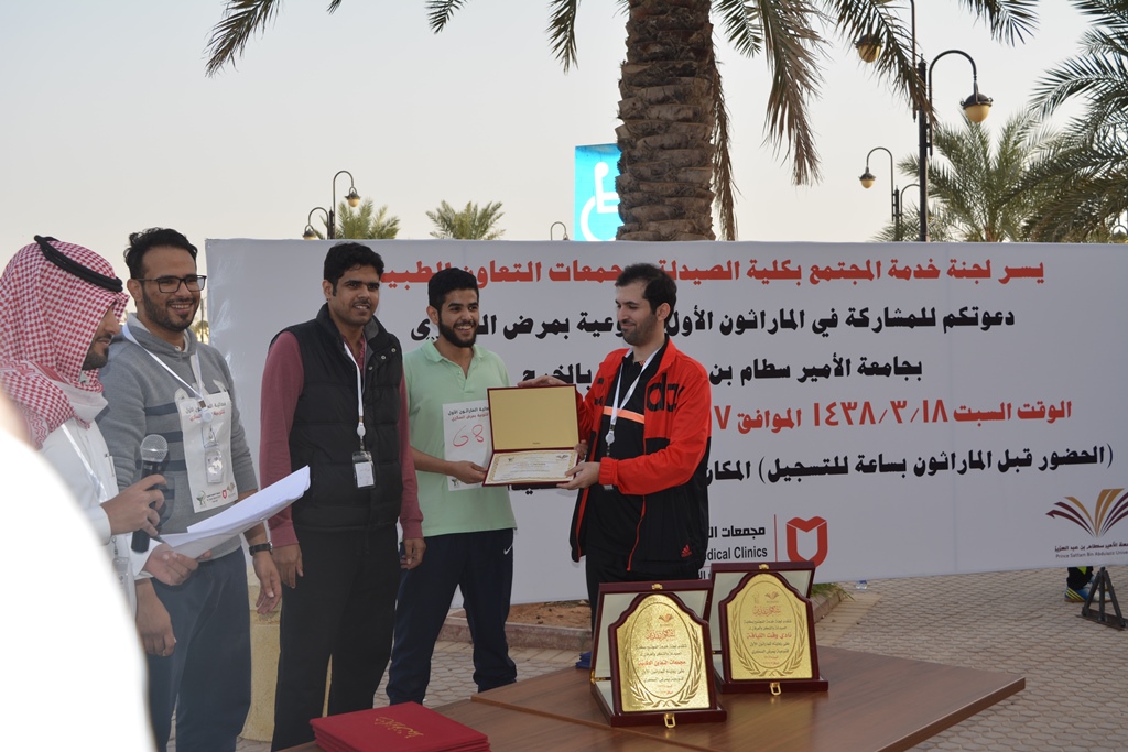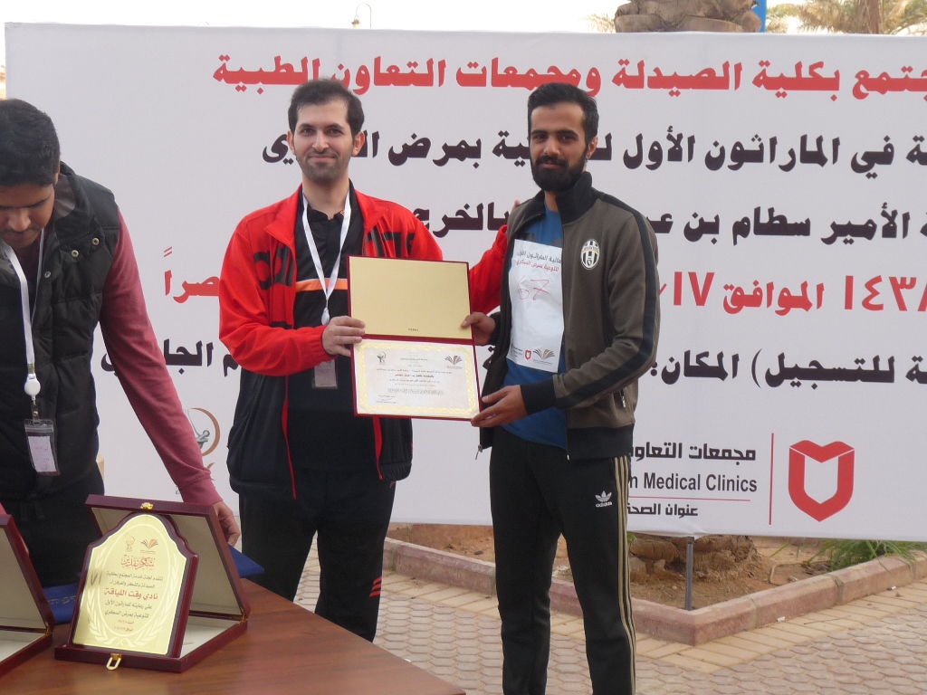 نظمت لجنة خدمة المجتمع بكلية الصيدلة في جامعة الامير سطام بن عبد العزيز فعالية الماراثون الأول للتوعية بمرض السكري برعاية كلاً من مجمعات التعاون الطبي ونادي وقت اللياقة في عصر يوم السبت 19/3/1438هـ الموافق 17/12/2016م. شارك في الحفل عدد كبير من مجتمع محافظة الخرج ومنسوبي جامعة الامير سطام بن عبد العزيز. تراوحت اعمار المشاركين ما بين 4 سنوات الى 60 سنة. وتخلل الفعالية قياس مستوى سكر الدم للمشاركين وتوزيع منشورات توعوية عن مرض السكري. وفي نهاية الحفل قام اعضاء لجنة خدمة المجتمع ( بحضور رئيس اللجنة سعادة الدكتور خالد بن مفلح الحارثي والأعضاء سعادة الدكتور فيصل بن فايح البقمي وسعادة الدكتور منشاوي عزمي منشاوي وسعادة الدكتور بدر بن بادي السليس وسعادة المحاضر عبدالله بن ترحيب المطيري ) بتوزيع الميداليات والعديد من الجوائز للفائزين بالماراثون وهم كالتالي:
