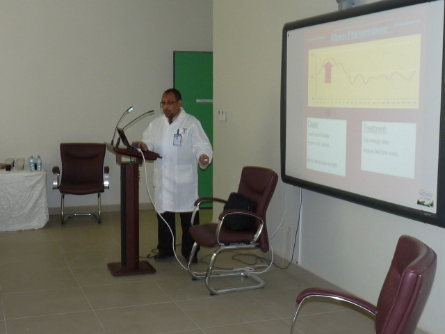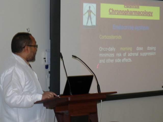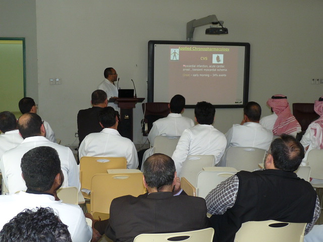 تحت رعاية عميد الكلية الأستاذ الدكتور خالد بن محمد الخرفي أقامت الكلية محاضرة بعنوان: ( دراسة التفاعل التداخلي للدواء مع توقيت تناوله ) والتي ألقاها الأستاذ الدكتور/ محمد عبدالغني عبدالمتعال الأستاذ والمشرف على قسم الصيدلة الإكلينيكية، وذلك يوم الثلاثاء 25/4/1435هـ الموافق 25/2/2014م الساعة الثانية عشر ظهراً، وكانت المحاضرة عن دراسة فاعلية الدواء، والاختلافات التي يمكن التنبؤ بها، عند تناوله في الوقت المناسب والآثار الدوائية المترتبة على ذلك. إنها تحقق دراسة الآثار / الجانبية للأدوية على التغيرات الزمنية في الوظائف البيولوجية أو أعراض للمرض فضلا عن فاعلية الدواء بوصفه في التوقيت البيولوجي، وكان ذلك في إطار أنشطة وحدة التطوير والجودة للكلية برئاسة وكيل الكلية للتطوير والجودة الدكتور عبدالله بن علي القحطاني في الفصل الدراسي الثاني للعام الجامعي 1434/1435هـ.