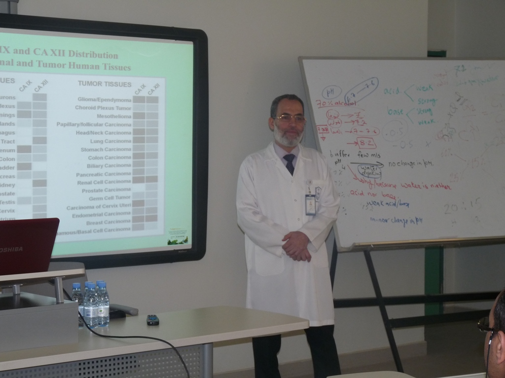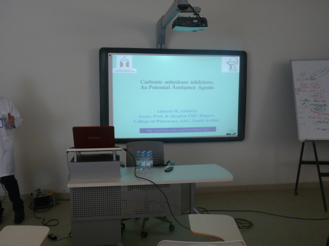 تحت رعاية عميد الكلية الدكتور خالد بن محمد الخرفي أقامت الكلية محاضرة بعنوان: ( مثبطات إنزيم الكربونيك أنهيدريز كمضادات محتملة للأورام السرطانية ) والتي ألقاها الدكتور/ أحمد محمود العفيفي الأستاذ المشارك والمشرف على قسم الكيمياء الصيدلية، وذلك يوم الثلاثاء 23/4/1434هـ الموافق 5/3/2013م ، حيث كانت المحاضرة عن تشييد بعض مشتقات مركبات السلفا والتي أثبتت فعاليتها كمثبطات لكل من إنزيم الكربونيك أنهيدريز التاسع والثاني عشر وهما المرتبطان إرتباطآ وثيقآ بنمو وإنتشار الأورام السرطانية، وكان ذلك في إطار أنشطة وحدة التطوير والجودة للكلية برئاسة وكيل الكلية للتطوير والجودة الدكتور عبدالله بن علي القحطاني في الفصل الدراسي الثاني للعام الجامعي 1433/1434هـ.