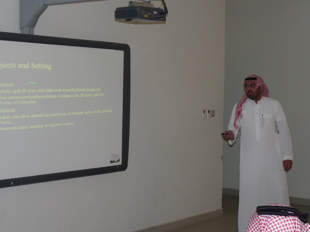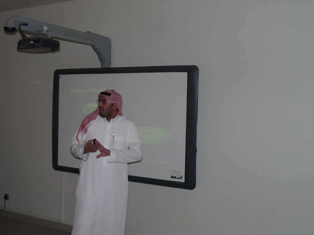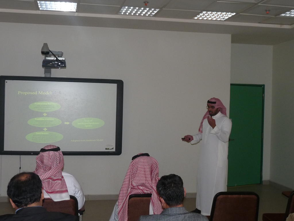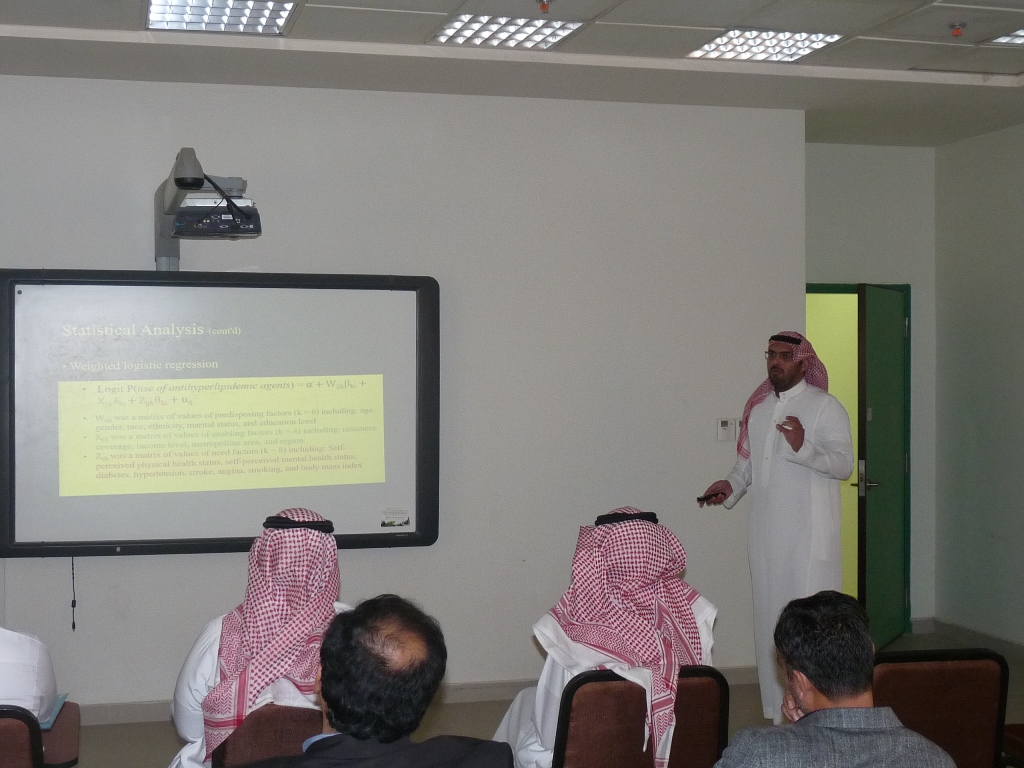 ( الروابط بين العوامل الاجتماعية والاقتصادية واستخدام ادوية الدهون: تطبيق لنظرية اندرسن الاجتماعية ) والتي ألقاها سعادة الدكتور/ عبدالله بن عثمان الثميري الأستاذ المساعد بقسم الصيدلة الإكلينيكية ورئيس القسم، وذلك يوم الثلاثاء 29/6/1438هـ الموافق 28/3/2017م الساعة الثانية عشر ظهراً بالقاعة التدريسية رقم ( 3 – ج - 7 ) بالكلية ، حيث كانت المحاضرة عن تطبيق نظرية اندرسن لاختبار الروابط بين العوامل الاجتماعية الاقتصادية وصرف الأدوية اللازمة لتخفيض الدهون في الدم. وقد ناقش الحاجة الماسة لإيجاد لوائح في الولايات المتحدة لزيادة الوعي لهذه الأدوية وإيجاد بدائل للمرضى بدون تأمينا صحياً.