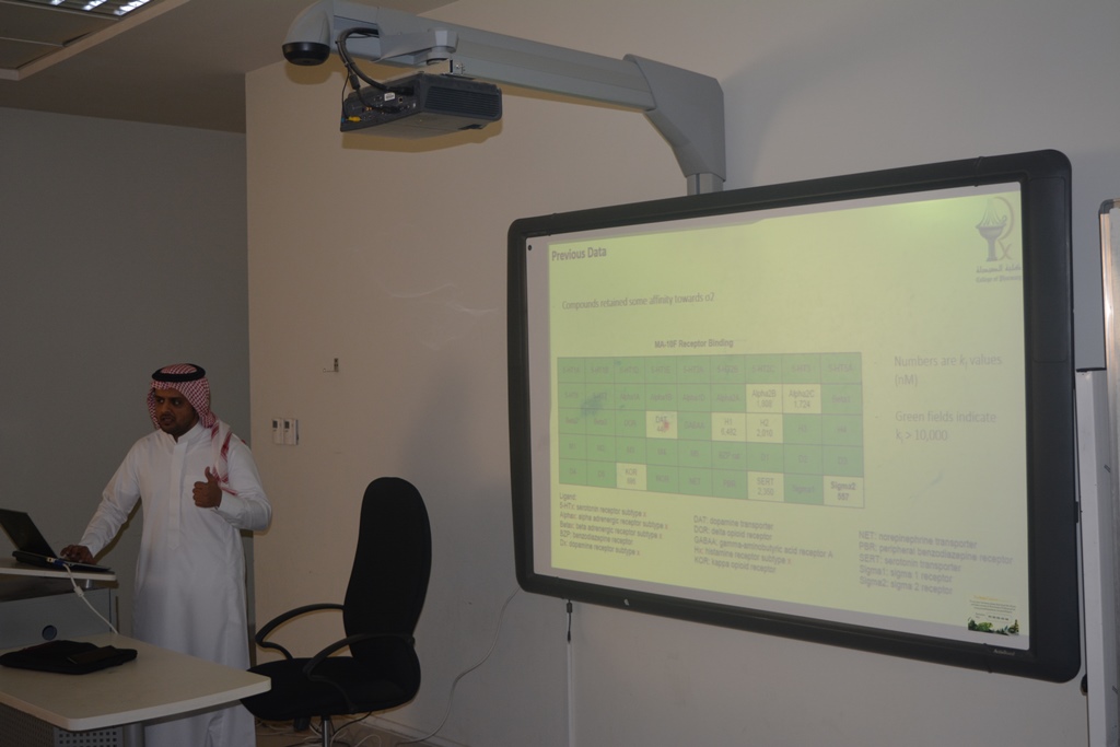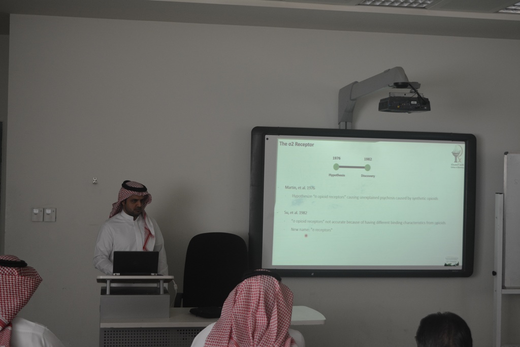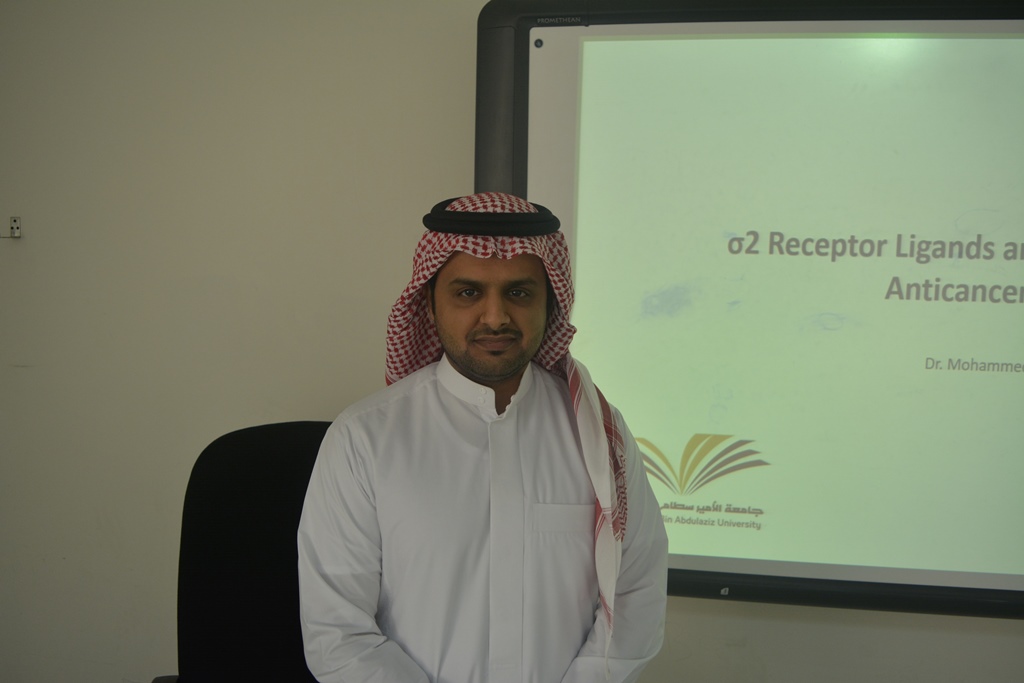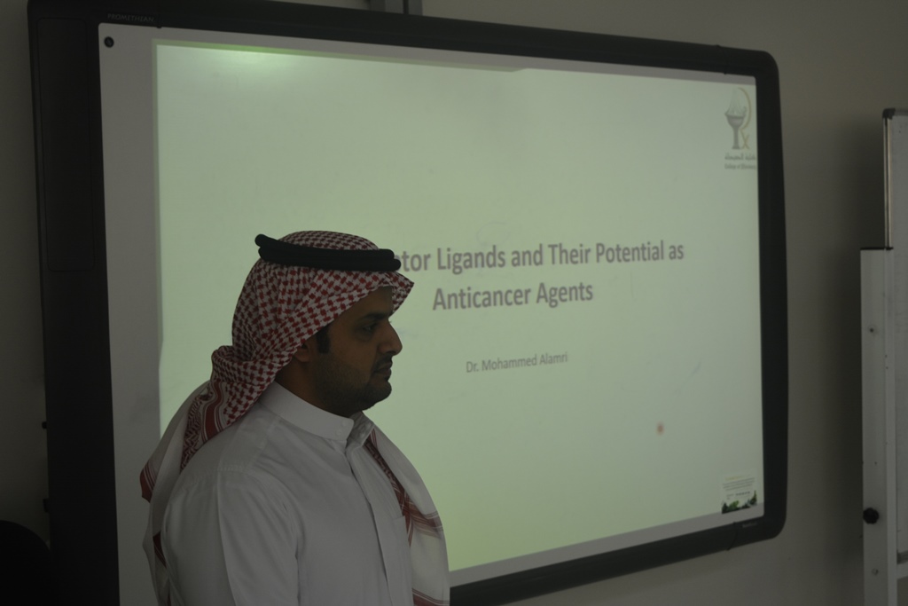 ( مستقبلات سيجما-2 كأهداف لتطوير أدوية مضادة للسرطان ) والتي ألقاها سعادة الدكتور/ محمد العمري الأستاذ المساعد بقسم علم الأدوية، وذلك يوم الاثنين 16/3/1439هـ الموافق 4/12/2017م الساعة الثانية عشر ظهراً بالقاعة التدريسية رقم ( 3 – ج - 7 ) بالكلية ، حيث كان هذا تقرير عن آخر الأبحاث المتمركزة حول مستقبل سيجما-2 و امكانية استهدافه لتطوير أدوية مضادة للسرطان. اضافة الى عرض فاعلية أدوية تستهدف مستقبل سيجما-2 مدمجة مع الدوكسوروبيسين و المواد المشعة، وكان ذلك من ضمن أنشطه الفصل الدراسي الأول للعام الجامعي 1438/1439هـ.