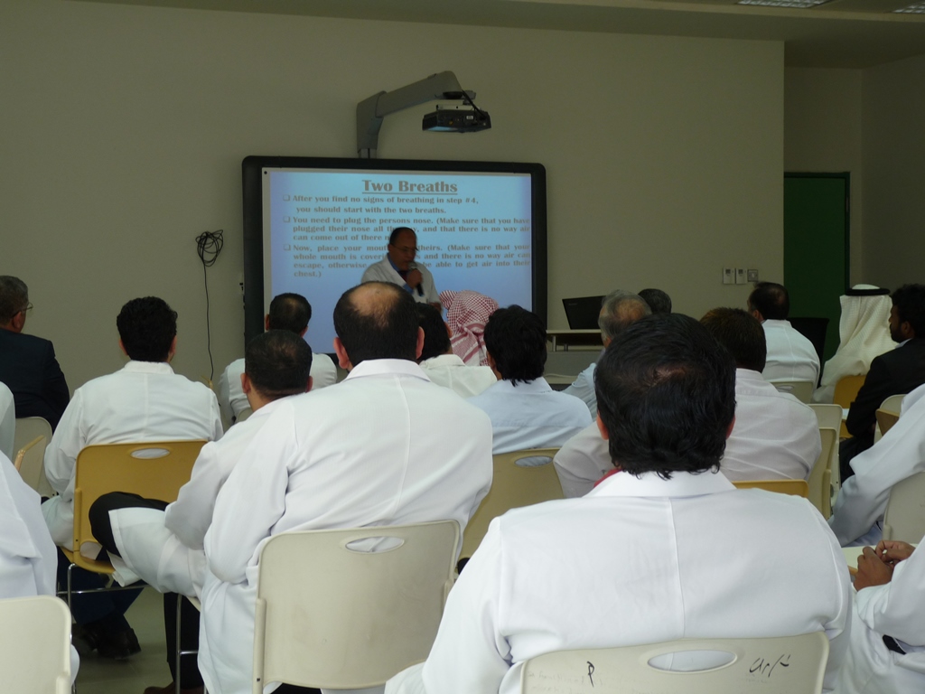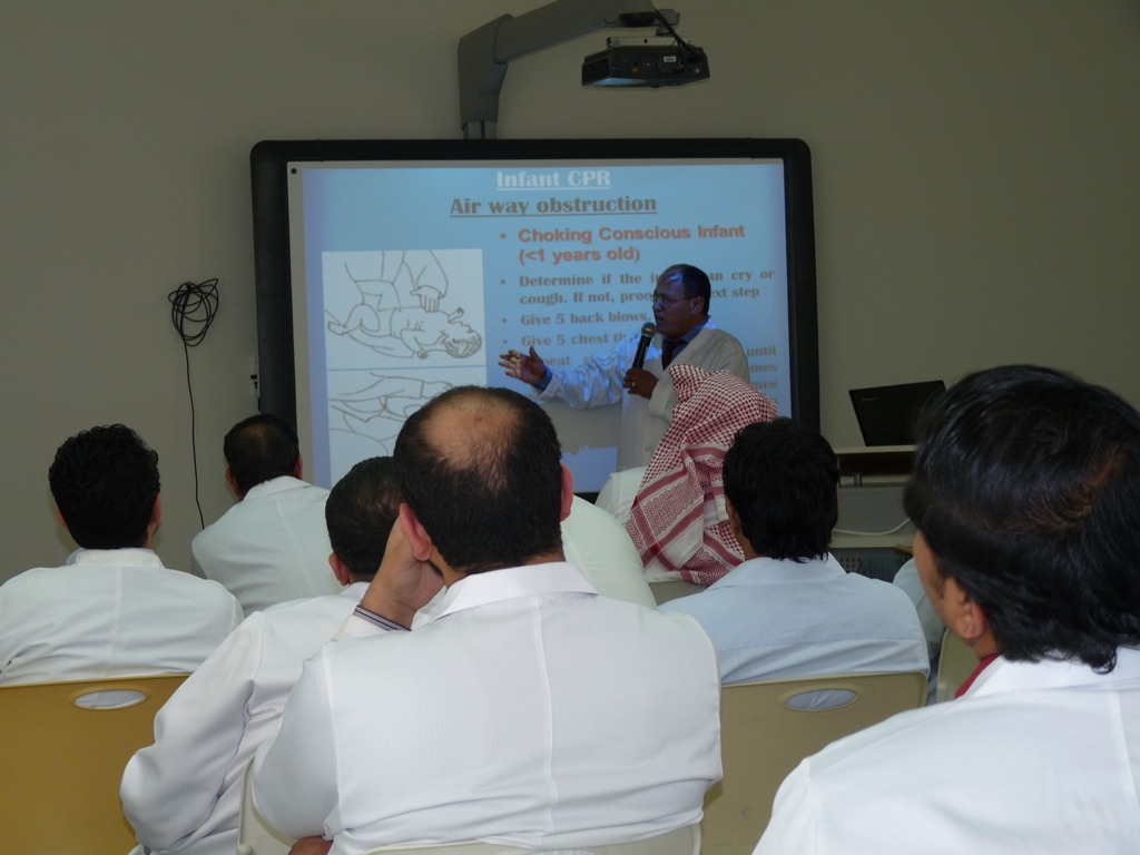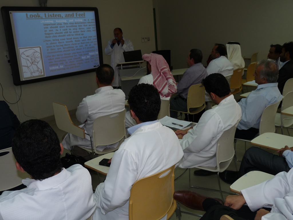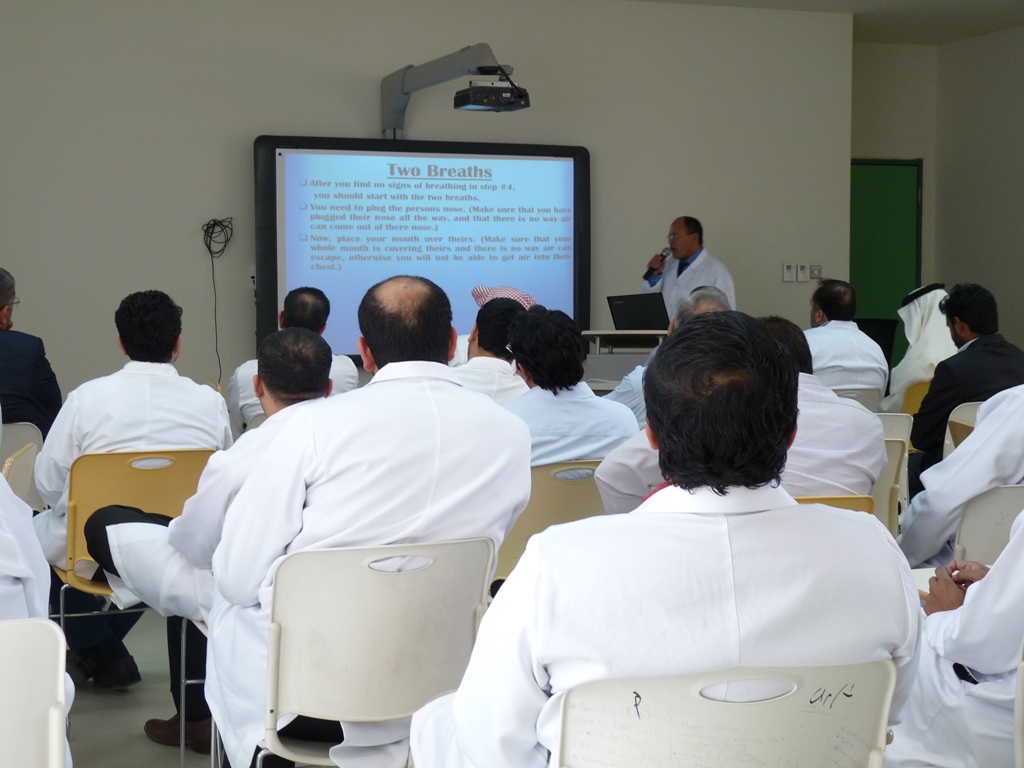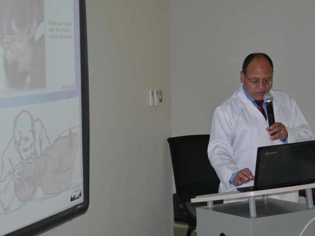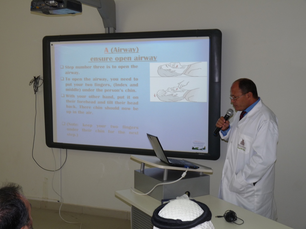 ( الانعاش القلبي الرئوي ) والتي ألقاها الدكتور/ جمال عبدالفتاح جبر الأستاذ المساعد بقسم علم الأدوية، وذلك يوم الثلاثاء 10/5/1435هـ الموافق 11/3/2014م الساعة الثانية عشر ظهراً، وكانت المحاضرة عن عملية إسعافية طارئة يقوم بها الشخص المسعف ويتم تنفيذها يدوياً في محاولة للحفاظ على وظائف الدماغ سليمة حتى يتم اتخاذ مزيد من التدابير لاستعادة عفوية الدورة الدموية والتنفس لإنقاذ حياة شخص مصاب بسكتة قلبية، يعتبر المريض الذي تجرى له عملية الإنعاش القلبي في حالة الموت السريري، وإذا لم يتم على الفور البدء بعملية الإنعاش فإن خلايا الدماغ تبدأ بالتلف غير الرجعي (الموت) خلال دقائق (10 دقائق)، وتختلف عملية الإنعاش بحسب المسعف، حيث تقسم إلى قسمين، إنعاش ابتدائي وانعاش متقدم، وهدف الإنعاش الأساسي هو الحفاظ على أكبر قدر من خلايا الدماغ في حالة الموت السريري وتوقف عضلة القلب عن الحركة (سكتة قلبية)، وذلك إلى حين وصول فريق الإسعاف الذي حينها يضطلع بالإسعاف المتقدم، والهدف من عملية الإنعاش القلبي الرئوي هو محاولة إعادة دورة دموية صغيرة يمكن أن تنقذ خلايا الدماغ من التلف التام أي الموت الدماغي. حيث من المعروف أن الدماغ إذا قُطع عنه الدم لفترة 4 دقائق فإن خلاياه تبدأ بالموت والتلف، وخلايا الدماغ لا يمكن استردادها، لهذا فعملية الإسعاف الأولي بإنعاش القلب والرئة هي محاولة لتحريك الدورة الدموية عن طريق الضغط على عضلة القلب من الخارج (بالضغط على القفص الصدري) حتى يتحرك الدم وبالتالي تصبح هناك دورة دموية بدائية تكفي لحين وصول الفريق الطبي المحترف. أي أن عملية الإسعاف الأولي هي وظيفة أي إنسان متواجد قرب المريض، وليست وظيفة الفريق الطبي غير المتواجد، وكان ذلك في إطار أنشطة وحدة التطوير والجودة للكلية برئاسة وكيل الكلية للتطوير والجودة الدكتور عبدالله بن علي القحطاني في الفصل الدراسي الثاني للعام الجامعي 1434/1435هـ.