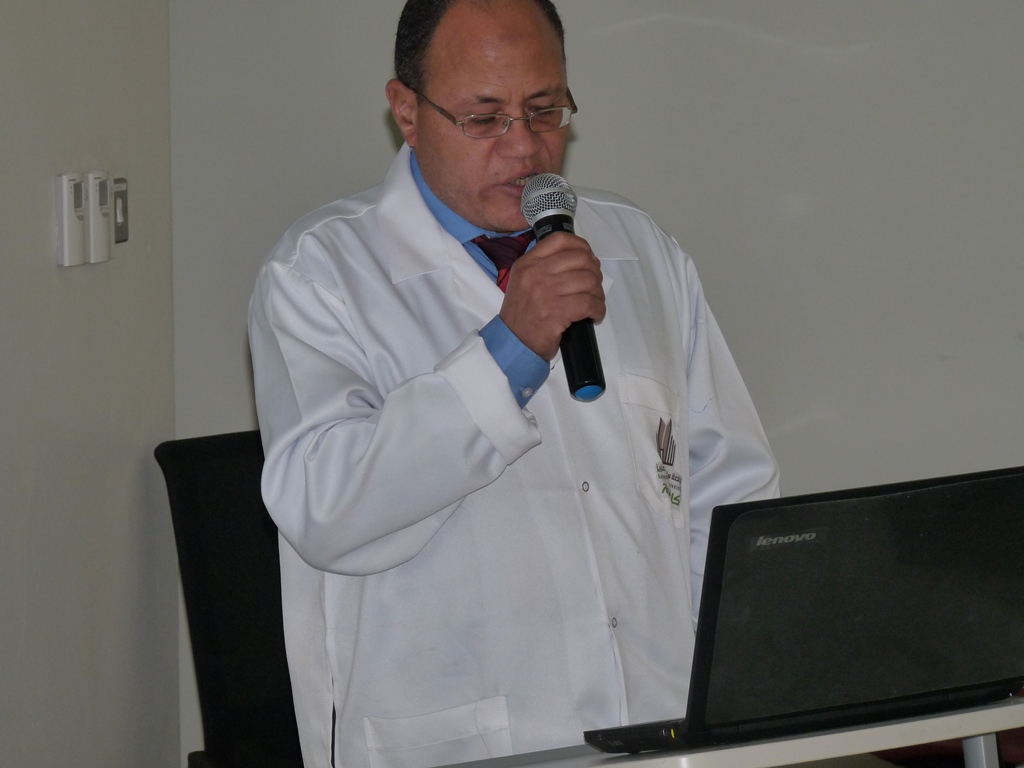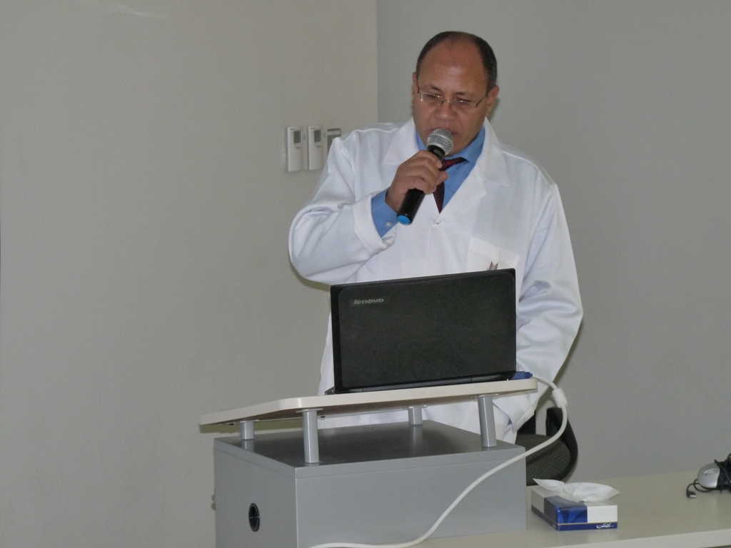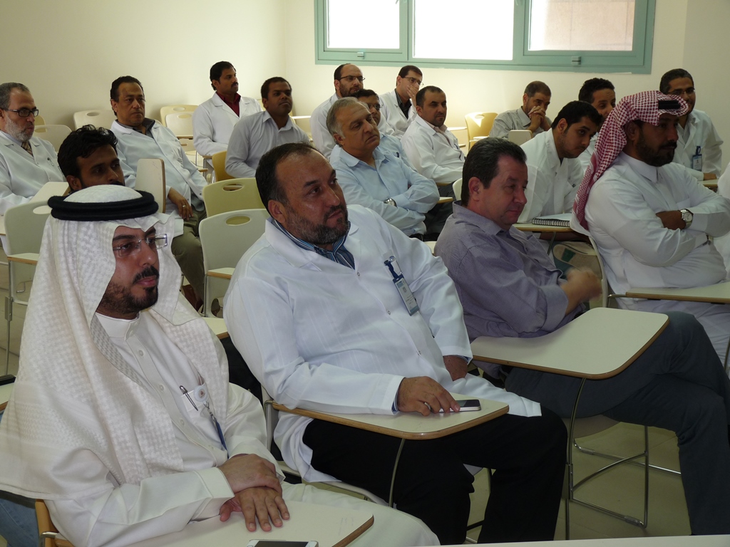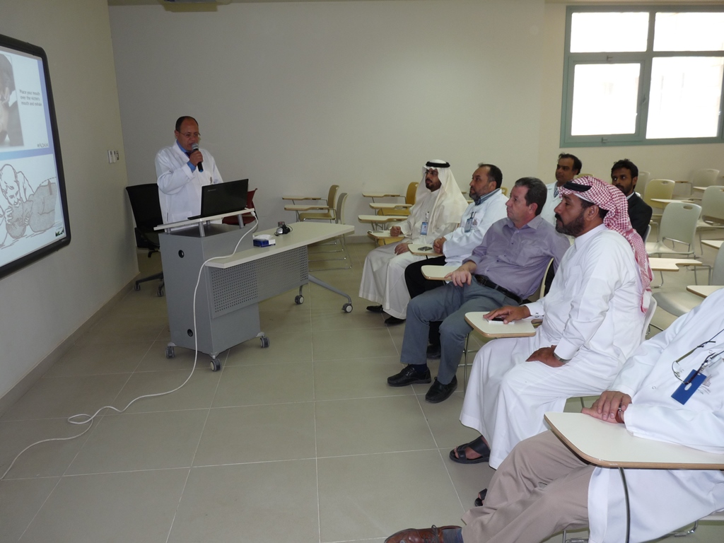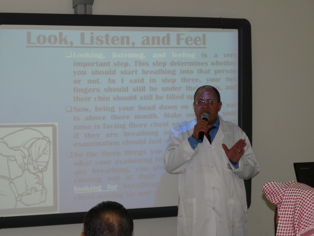 ( الانعاش القلبي الرئوي ) والتي ألقاها الدكتور/ جمال عبدالفتاح جبر الأستاذ المساعد بقسم علم الأدوية، وذلك يوم الثلاثاء 10/5/1435هـ الموافق 11/3/2014م الساعة الثانية عشر ظهراً، وكانت المحاضرة عن عملية إسعافية طارئة يقوم بها الشخص المسعف ويتم تنفيذها يدوياً في محاولة للحفاظ على وظائف الدماغ سليمة حتى يتم اتخاذ مزيد من التدابير لاستعادة عفوية الدورة الدموية والتنفس لإنقاذ حياة شخص مصاب بسكتة قلبية، يعتبر المريض الذي تجرى له عملية الإنعاش القلبي في حالة الموت السريري، وإذا لم يتم على الفور البدء بعملية الإنعاش فإن خلايا الدماغ تبدأ بالتلف غير الرجعي (الموت) خلال دقائق (10 دقائق)، وتختلف عملية الإنعاش بحسب المسعف، حيث تقسم إلى قسمين، إنعاش ابتدائي وانعاش متقدم، وهدف الإنعاش الأساسي هو الحفاظ على أكبر قدر من خلايا الدماغ في حالة الموت السريري وتوقف عضلة القلب عن الحركة (سكتة قلبية)، وذلك إلى حين وصول فريق الإسعاف الذي حينها يضطلع بالإسعاف المتقدم، والهدف من عملية الإنعاش القلبي الرئوي هو محاولة إعادة دورة دموية صغيرة يمكن أن تنقذ خلايا الدماغ من التلف التام أي الموت الدماغي. حيث من المعروف أن الدماغ إذا قُطع عنه الدم لفترة 4 دقائق فإن خلاياه تبدأ بالموت والتلف، وخلايا الدماغ لا يمكن استردادها، لهذا فعملية الإسعاف الأولي بإنعاش القلب والرئة هي محاولة لتحريك الدورة الدموية عن طريق الضغط على عضلة القلب من الخارج (بالضغط على القفص الصدري) حتى يتحرك الدم وبالتالي تصبح هناك دورة دموية بدائية تكفي لحين وصول الفريق الطبي المحترف. أي أن عملية الإسعاف الأولي هي وظيفة أي إنسان متواجد قرب المريض، وليست وظيفة الفريق الطبي غير المتواجد، وكان ذلك في إطار أنشطة وحدة التطوير والجودة للكلية برئاسة وكيل الكلية للتطوير والجودة الدكتور عبدالله بن علي القحطاني في الفصل الدراسي الثاني للعام الجامعي 1434/1435هـ.
