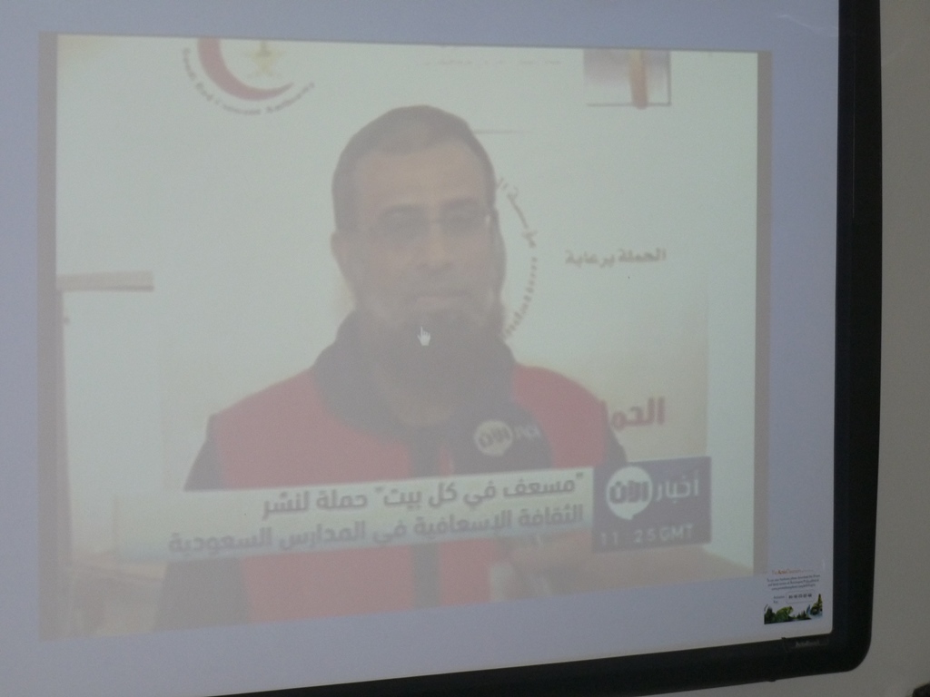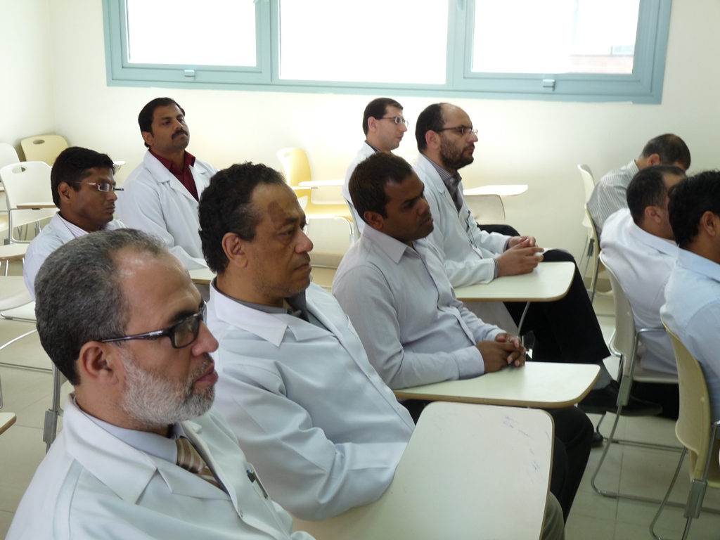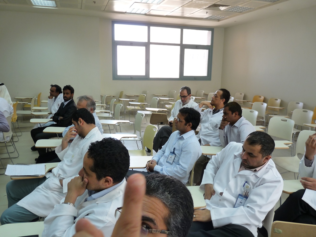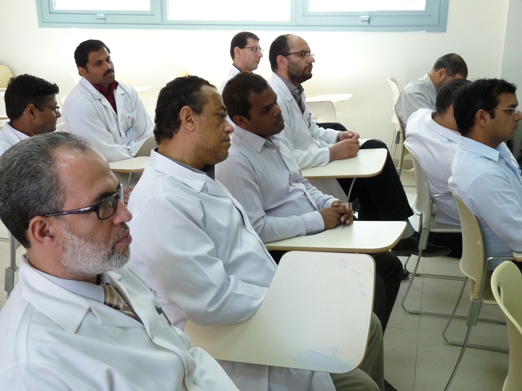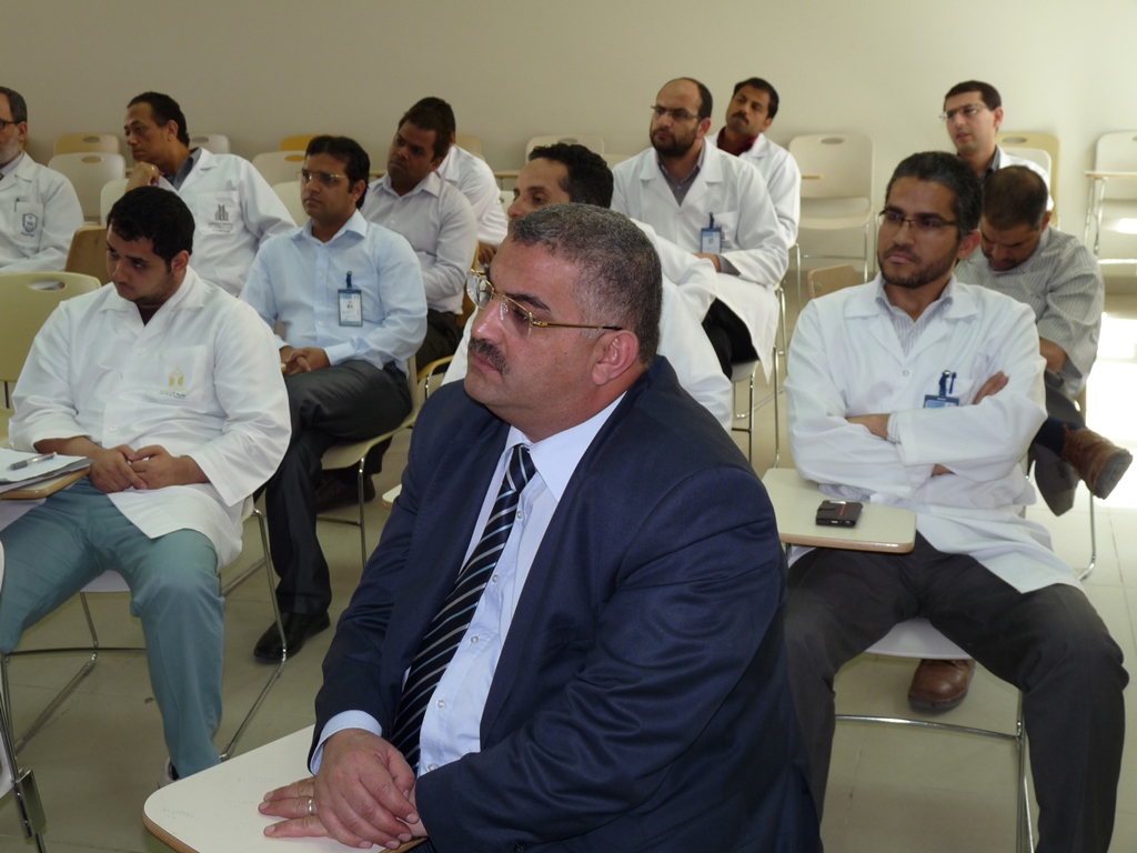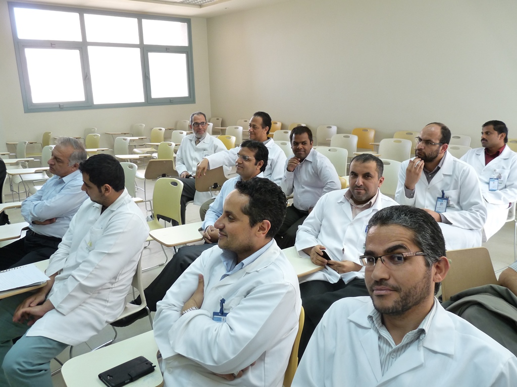 ( الانعاش القلبي الرئوي ) والتي ألقاها الدكتور/ جمال عبدالفتاح جبر الأستاذ المساعد بقسم علم الأدوية، وذلك يوم الثلاثاء 10/5/1435هـ الموافق 11/3/2014م الساعة الثانية عشر ظهراً، وكانت المحاضرة عن عملية إسعافية طارئة يقوم بها الشخص المسعف ويتم تنفيذها يدوياً في محاولة للحفاظ على وظائف الدماغ سليمة حتى يتم اتخاذ مزيد من التدابير لاستعادة عفوية الدورة الدموية والتنفس لإنقاذ حياة شخص مصاب بسكتة قلبية، يعتبر المريض الذي تجرى له عملية الإنعاش القلبي في حالة الموت السريري، وإذا لم يتم على الفور البدء بعملية الإنعاش فإن خلايا الدماغ تبدأ بالتلف غير الرجعي (الموت) خلال دقائق (10 دقائق)، وتختلف عملية الإنعاش بحسب المسعف، حيث تقسم إلى قسمين، إنعاش ابتدائي وانعاش متقدم، وهدف الإنعاش الأساسي هو الحفاظ على أكبر قدر من خلايا الدماغ في حالة الموت السريري وتوقف عضلة القلب عن الحركة (سكتة قلبية)، وذلك إلى حين وصول فريق الإسعاف الذي حينها يضطلع بالإسعاف المتقدم، والهدف من عملية الإنعاش القلبي الرئوي هو محاولة إعادة دورة دموية صغيرة يمكن أن تنقذ خلايا الدماغ من التلف التام أي الموت الدماغي. حيث من المعروف أن الدماغ إذا قُطع عنه الدم لفترة 4 دقائق فإن خلاياه تبدأ بالموت والتلف، وخلايا الدماغ لا يمكن استردادها، لهذا فعملية الإسعاف الأولي بإنعاش القلب والرئة هي محاولة لتحريك الدورة الدموية عن طريق الضغط على عضلة القلب من الخارج (بالضغط على القفص الصدري) حتى يتحرك الدم وبالتالي تصبح هناك دورة دموية بدائية تكفي لحين وصول الفريق الطبي المحترف. أي أن عملية الإسعاف الأولي هي وظيفة أي إنسان متواجد قرب المريض، وليست وظيفة الفريق الطبي غير المتواجد، وكان ذلك في إطار أنشطة وحدة التطوير والجودة للكلية برئاسة وكيل الكلية للتطوير والجودة الدكتور عبدالله بن علي القحطاني في الفصل الدراسي الثاني للعام الجامعي 1434/1435هـ.