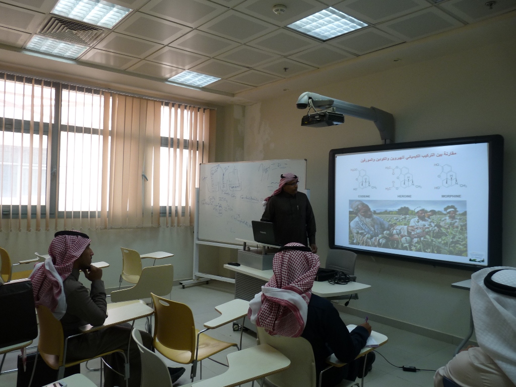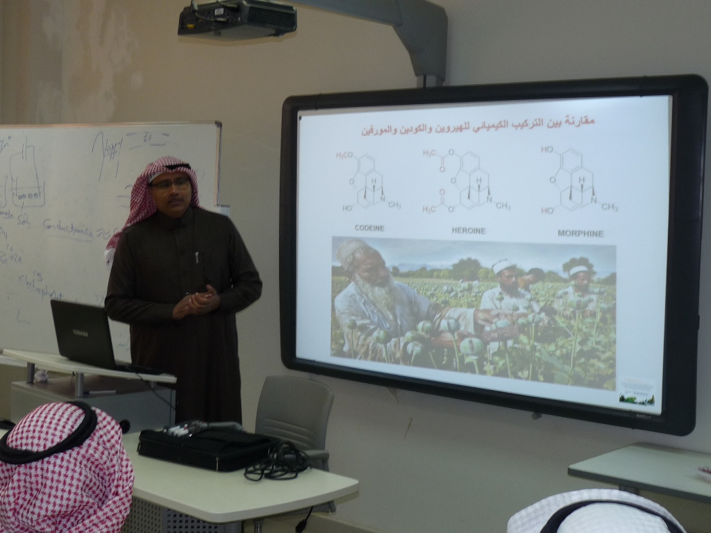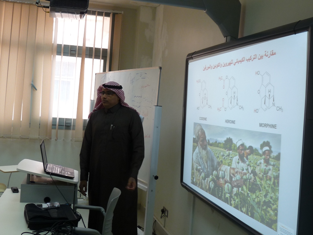 تحت رعاية الأستاذ الدكتور خالد بن محمد الخرفي عميد كلية الصيدلة ورئيس فريق التعاون بين الجامعة والمديرية العامة لمكافحة وفي إطار البرنامج التدريبي ( أساسيات و تطبيقات في التحليل الآلي للتعيين الكيفي والكمي للمخدرات ) يلقي الدكتور/ محمد حسين طاهر قيسي الأستاذ المساعد بقسم الكيمياء بكلية العلوم والدراسات الإنسانية وكيل عمادة البحث العلمي محاضرة بعنوان : ( كيمياء المخدرات )، وذلك يوم الاثنين 17/3/1437هـ الموافق 28/12/2015م الساعة العاشرة صباحاً، حيث تهدف هذه المحاضرة التعريف بالتركيب الكيميائي للمخدرات الشائعة.