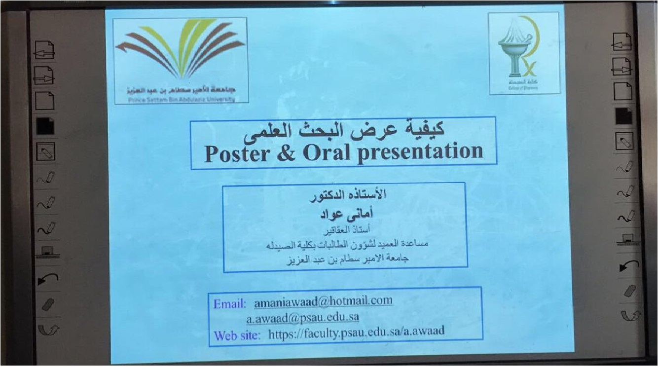 نظم نادي البحث العلمي بالتعاون مع لجنة خدمة المجتمع بالكلية محاضرة عن كيفية عرض البحث العلمي بطريقة الملصق والعرض المرئي وذلك يوم الأثنين الموافق 30\5\1438ه بهدف رفع مستوى الطالبات في كيفية إعدادها و وتعليم الطالبات المبدأ الصحيح والسليم لعمل ملصق علمي صحيح خالي من الأخطاء ألقتها أ.د.أماني عواد مساعدة عميد الكلية وبحضور عدد كبير من الطالبات ،حيث أوضحت الدكتورة أن إتقان مثل هذه المهارة يساعد في إبراز فكرة البحث العلمي بشكل واضح ومباشر للجمهور ومن ثم شرحت الدكتورة ماهي المواصفات العلمية لكتابة الملصق العلمي والمرئي ولخصتها في أربع نقاط أساسية وهي ماذا يجب أن يوضع في الملصق العلمي وكيف يوضع. ثم المحذورات بالملصق العلمي والأخطاء الشائعة و كيفية إلقاء العرض لأي مشروع و جذب المستمعين في الابتداء والختام