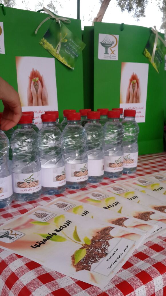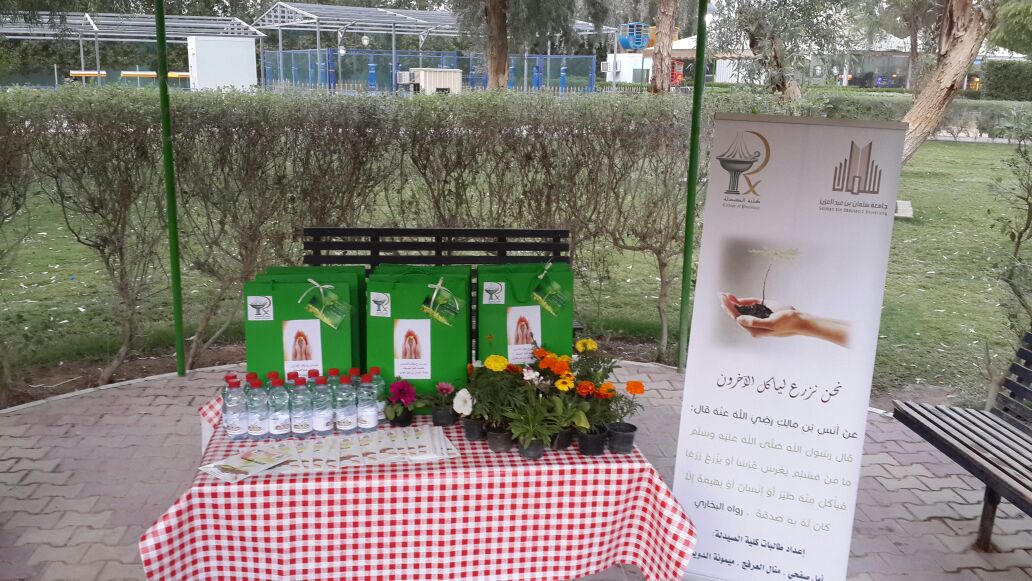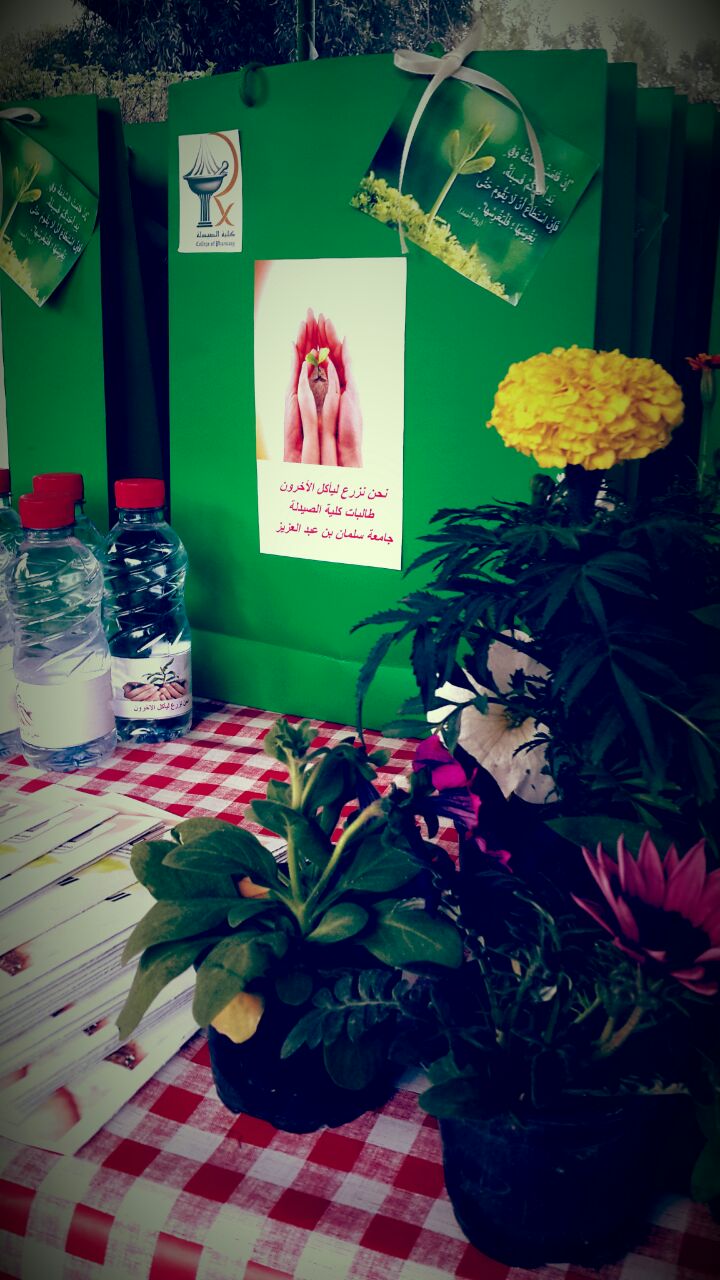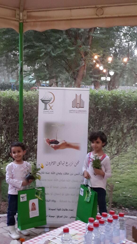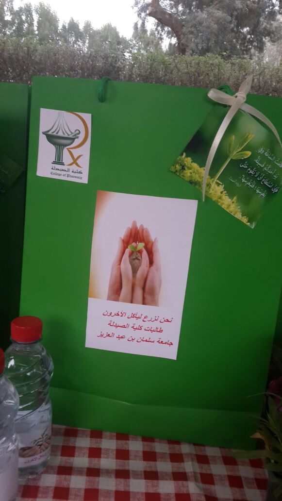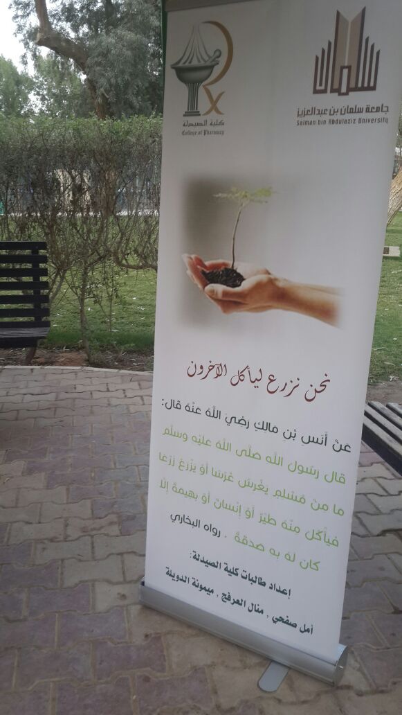 ضمن نشاطات خدمة المجتمع في كلية الصيدلة لأقسام البنات نظمت مجموعة من الطالبات حملة (نحن نزرع ليأكل الاخرين ) وذلك يوم السبت الموافق 2 - 5 - 1436هـ في منتزه المشتل بالخرج وتضمن النشاط لافتات تعريفية بفائدة الزراعة ومطويات جذابة من تصميم الطالبات توضح فضل عمارة الأرض و أهمية الزراعة في الإسلام وفوائدها ومجالاتها وأيضاً احتوى على هدايا للأطفال تشجعهم على الزراعة (حراثة وفأس ) وألعاب تلوين عن الشجر لغرس حب الزراعة في الأطفال بالإضافة إلى توزيع بعض الشتلات والورود للأطفال والمتنزهين بالمشتل ‘ يذكر ان الطالبات المنظمات للنشاط هن : 1.أمل أحمد صفحي 1.منال صالح العرفج 1.ميمونة صالح الدويلة