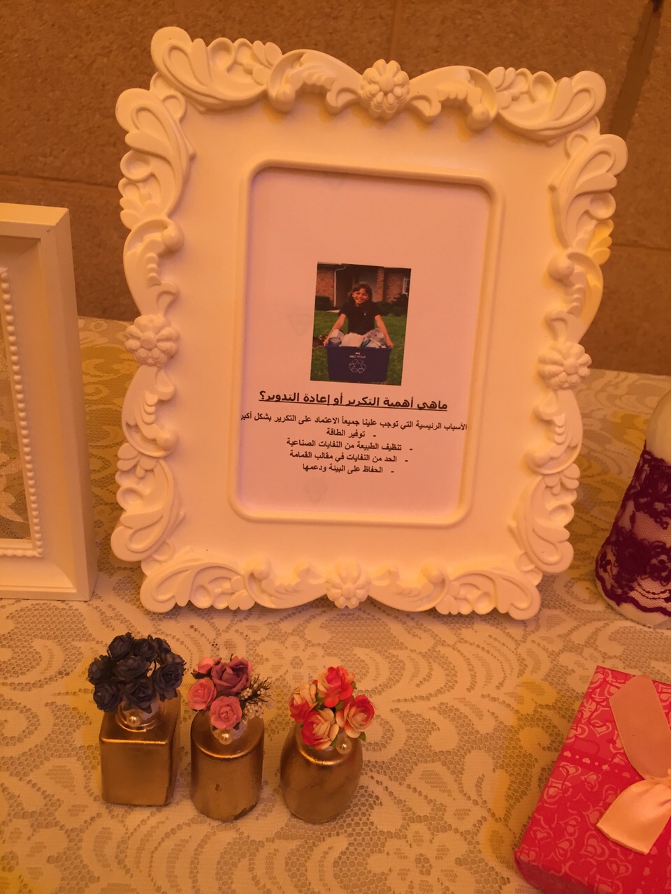 حيث شمل البرنامج على ركن تم عرض فيها عينات تم اعادة تدويرها بطرق أكثر إبداعية وتم شرح طرق عملها وإعطاء بعض الأفكار والإلهام لحث الطالبات على القيام والمشاركة بهذا الموضوع.
