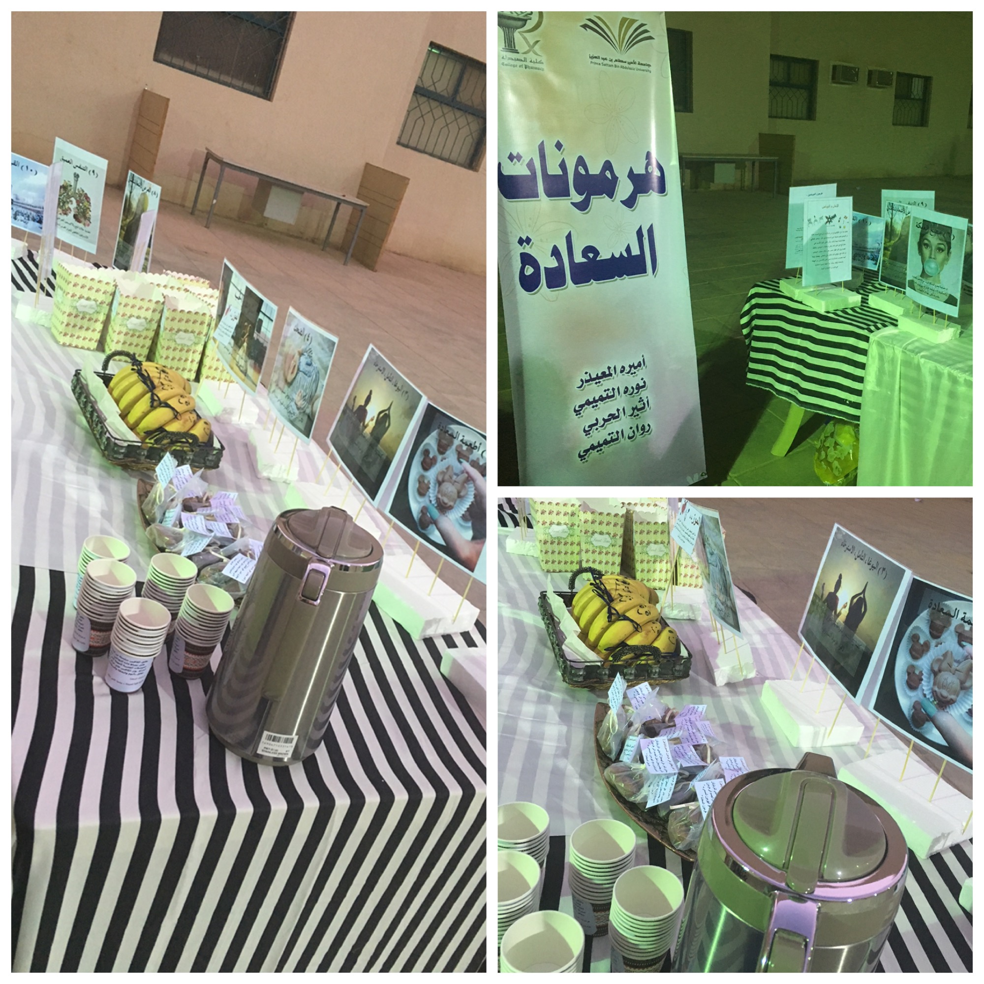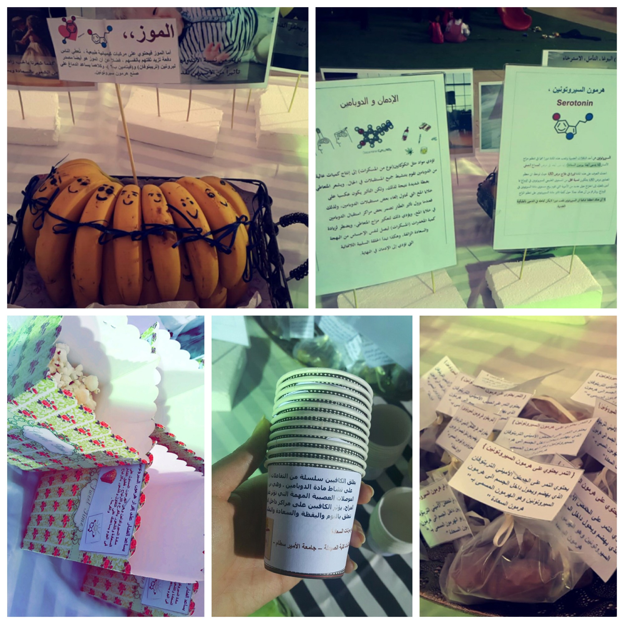 نحن نورة التميمي, أثير الحربي, أميرة المعيذر طالبات كلية الصيدلة المستوى الخامس قمنا بتفعيل نشاط بعنوان "هرمونات السعادة" في نادي الحي بالثانوية الثامنة بالخرج يوم الاحد ١٠/٢/١٤٣٧هـ تحدثنا فيه عن انواع هرمونات السعادة وفوائدها للانسان و من اين يمكننا الحصول عليها واحضرنا بعض النماذج لبعض الأطعمة التي تحتوي على هرمونات السعادة.