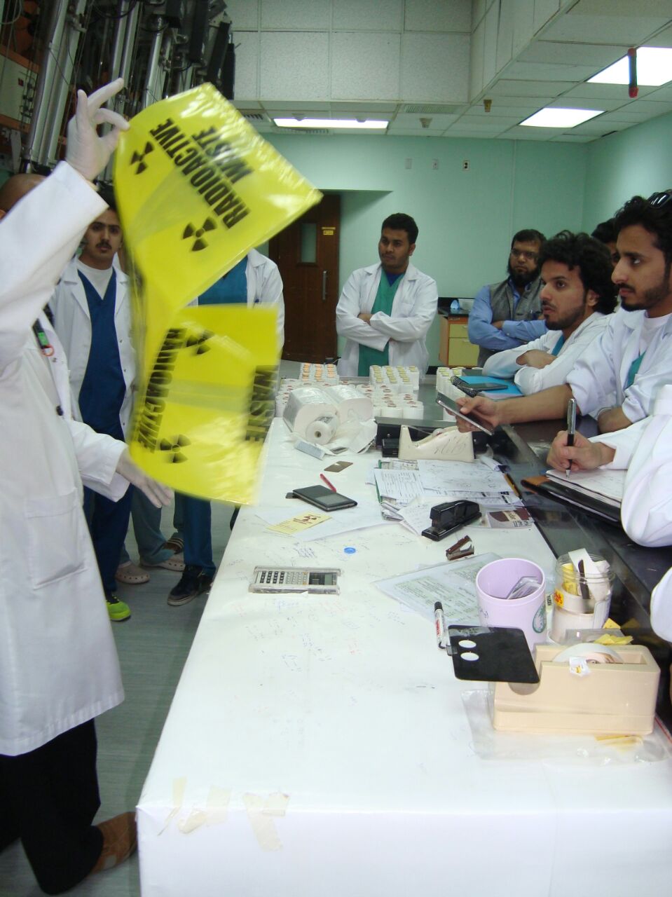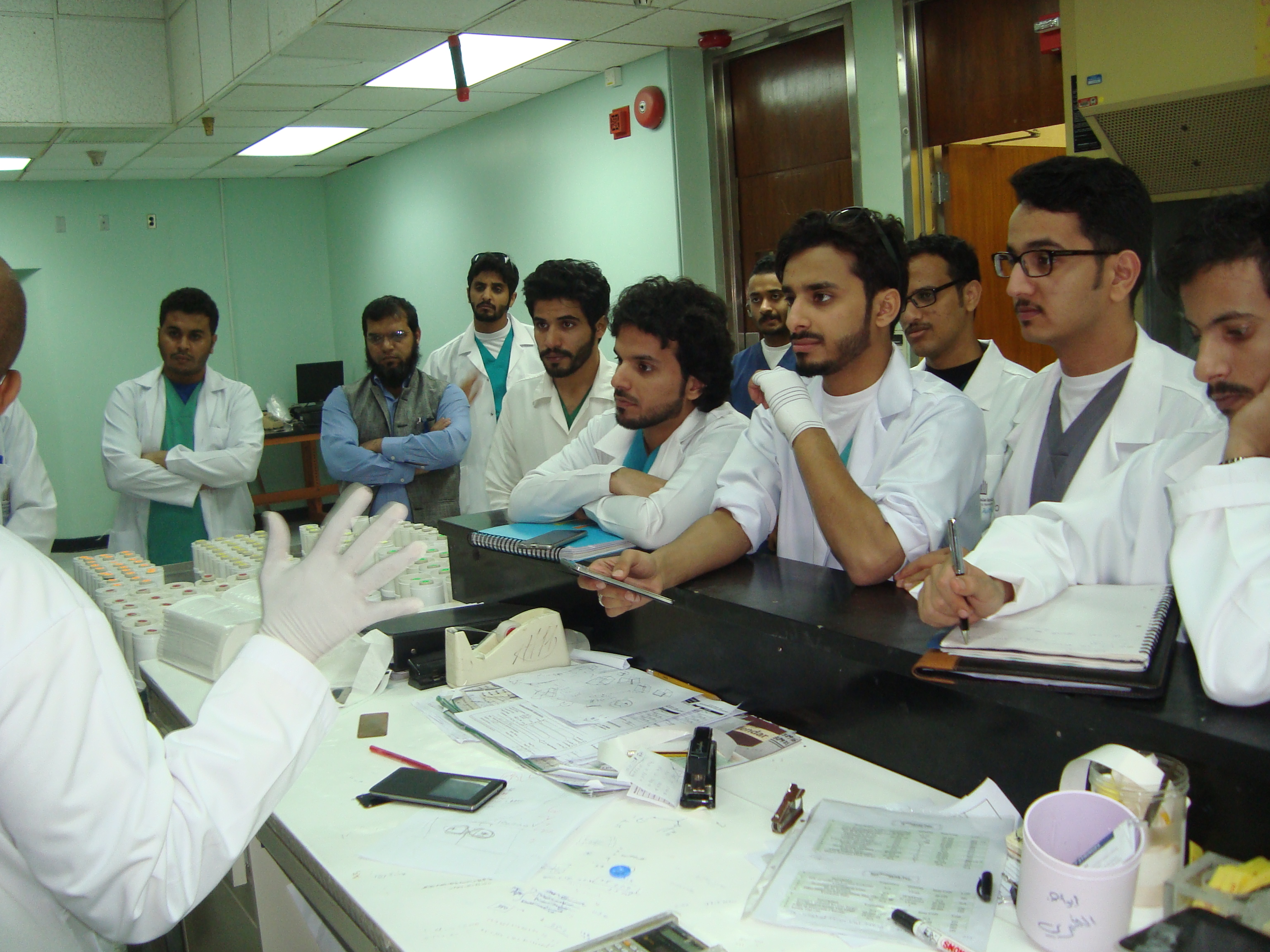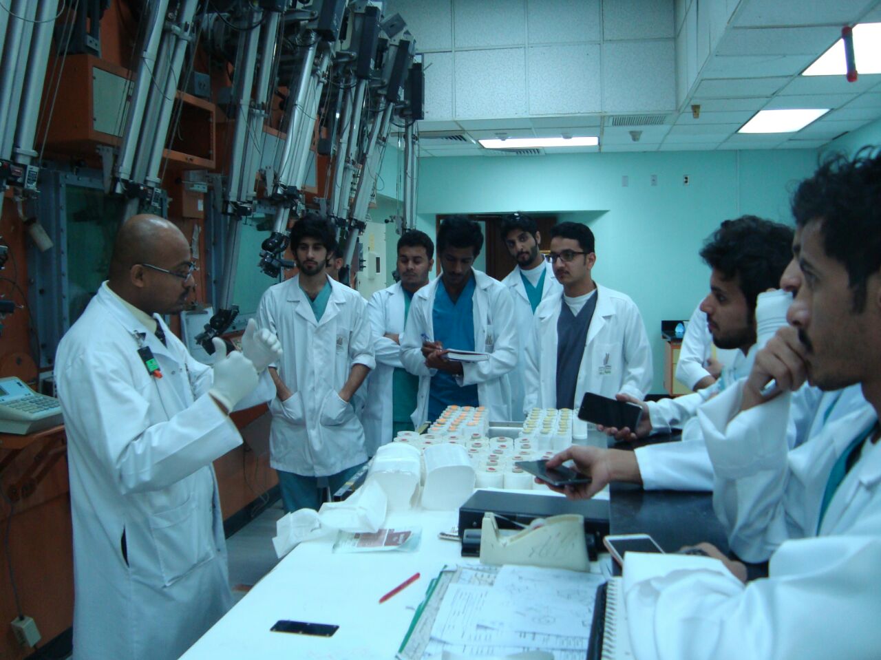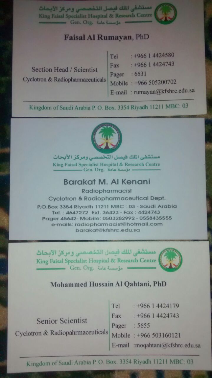 بتوجيهات من سعادة عميد كلية الصيدلة الأستاذ الدكتور خالد بن محمد الخرفي قام قسم الصيدلانيات بعمل زيارة الى مركز الابحاث (قسم السايكلترون والمستحضرات الصيدلانية المشعة والاقسام الرئيسية الاخرى) في مستشفى الملك فيصل التخصصي ومركز الابحاث، وذلك لطلاب المستوى التاسع المسجلين في مادة الصيدلة النووية لتحقيق اكبر قدر من الاستفادة لصالح الطلاب، وقد تلقى الطلاب معلومات نظرية وعملية قيمة ومفيدة جدا عن الادوية المشعة وطريقة تحضيرها وآلية صرفها والأجهزة المستخدمة في تحضير هذه المواد. كما وقد شرح للطلاب آخر التطورات العلمية المتبعة في هذا المجال. وقد كان برفقة الطلاب خلال هذه الزيارة كلا من منسق الزيارة د. محمد مقتدر احمد والمشرف على قسم الصيدلانيات د. محمد جافيد انصاري وكان ذلك يوم الخميس 27/6/1436هـ الموافق 16/4/2015م.