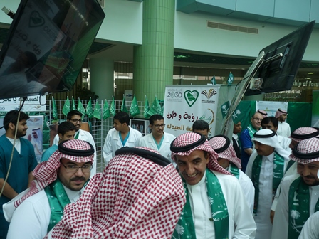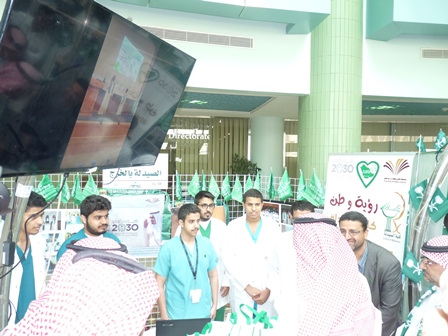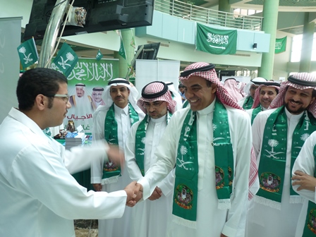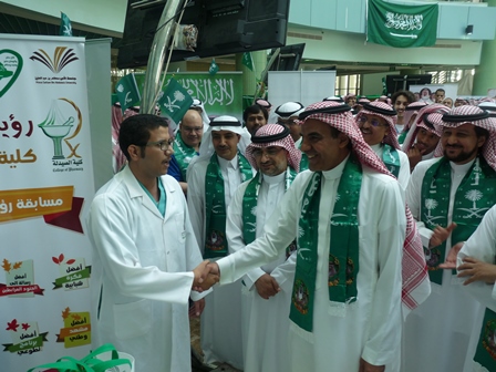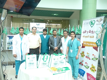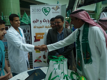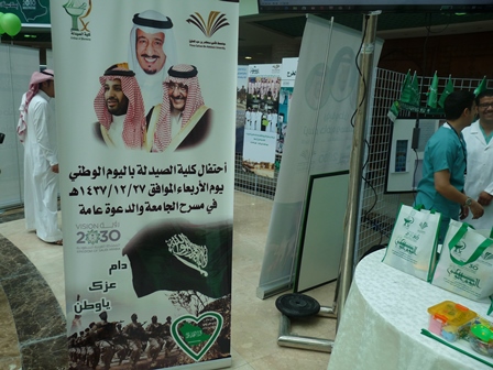شاركت كلية الصيدلة احتفال الجامعة باليوم الوطني للمملكة (86) والذى اقامته عمادة شئون الطلاب بعناية معالى مدير الجامعة الدكتور عبد الرحمن بن محمد العاصمي وبحضور سعادة الوكلاء والعمداء واعضاء هيئة التدريس وذلك بمسرح الجامعة يوم الأربعاء 4/1/1438هـ الساعة الحادية عشر صباحاً حيث كُرم معالى مدير الجامعة الطلاب الفائزين في مسابقة رؤية وطن وكان لكلية الصيدلة نصيب كبير من التكريم حيث فاز بالمركز الثاني كأفضل فريق تطوعي للطلاب الآتي أسماؤهم:
