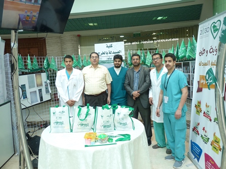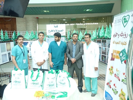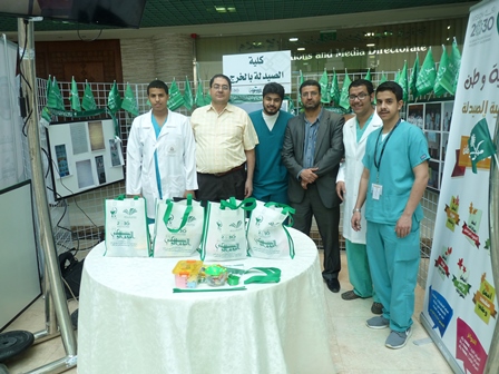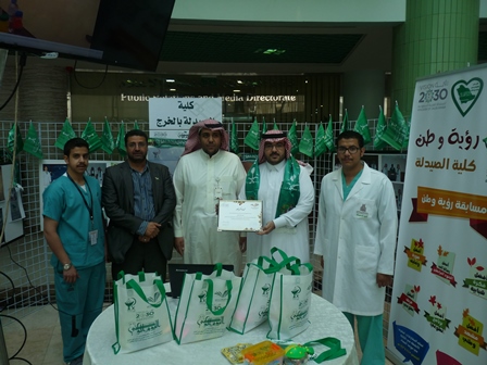 كما كرم معالى مدير الجامعة الكلية لمشاركتها المميزة بالمعرض حيث سلم معالى المدير شهادة التكريم لسعادة وكيل الكلية للشؤون التعليمية والأكاديمية الدكتور أحمد بن إبراهيم فوده وبعد انتهاء الحفل تفقد معالي مدير الجامعة ووكلاء الجامعة المعرض الخاص بكليات الجامعة المشاركة في الحفل في بهو الجامعة وكان باستقبال معاليه بركن كلية الصيدلة كل من سعادة وكيل الكلية للشؤون التعليمية والأكاديمية الدكتور أحمد بن إبراهيم فوده وسعادة مشرف الأنشطة الطلابية الدكتور منشاوي عزمي منشاوي وبعض طلاب الكلية وبوصول معاليه لركن كلية الصيدلة تقدم الطالب فيصل الدوسري بالترحيب بمعاليه وألقى قصيدة في حب الوطن نالت استحسان معاليه ووكلاء الجامعة حيث شمل معرض الكلية على العديد من الصور التي تبرز فعاليات كلية الصيدلة احتفالا باليوم الوطني (86) ولوحات لأعمال الطلاب، وشمل معرض الكلية على عرض لفيلم وثائقي عن احتفال الكلية باليوم الوطني للمملكة وكذلك حقيبة بها لعب أطفال المقدمة من مجموعة الكلية لأطفال أسر المساجين.