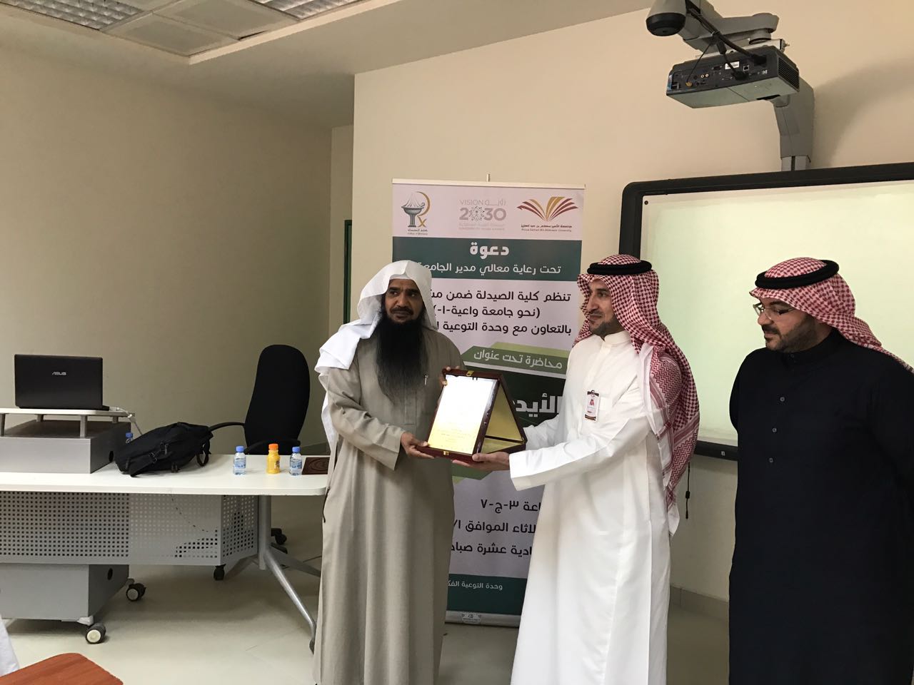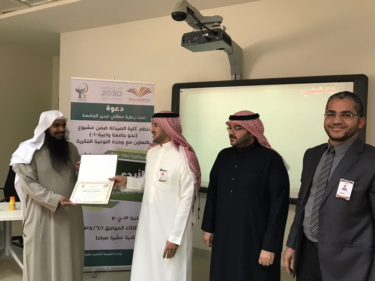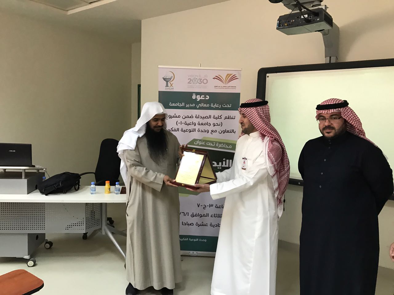 وفي نهاية المحاضرة كرم سعادة عميد كلية الصيدلة الدكتور فهد بن إبراهيم الصيخان ووكيل الكلية للشؤون التعليمية والأكاديمية الدكتور أحمد بن إبراهيم فوده ومنسق وحدة التوعية الفكرية بالكلية الدكتور عبدالرحيم محمد دنيا الأستاذ الدكتور خالد الدبيان بدرع وشهادة شكر وتقدير نظير تلبيته الدعوة متمنين أن تستمر مثل هذه المحاضرات لما فيها من فوائد تعود بالنفع.