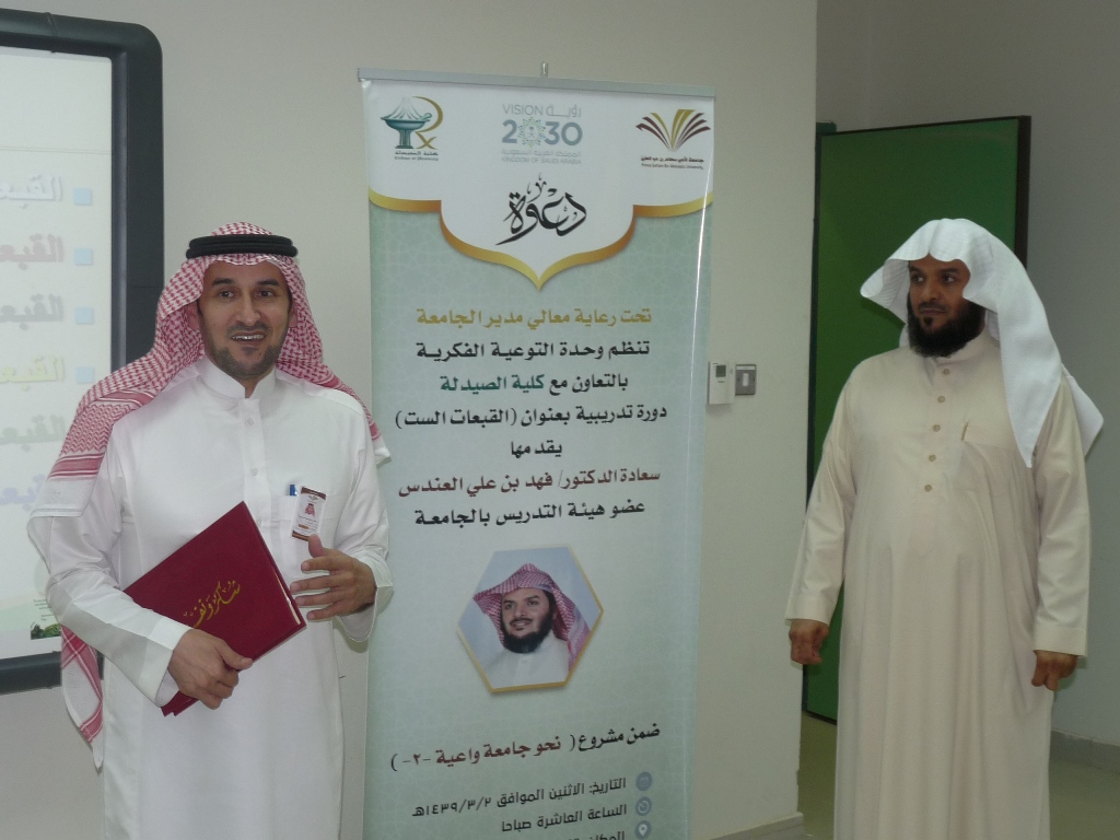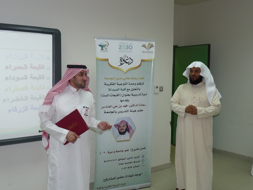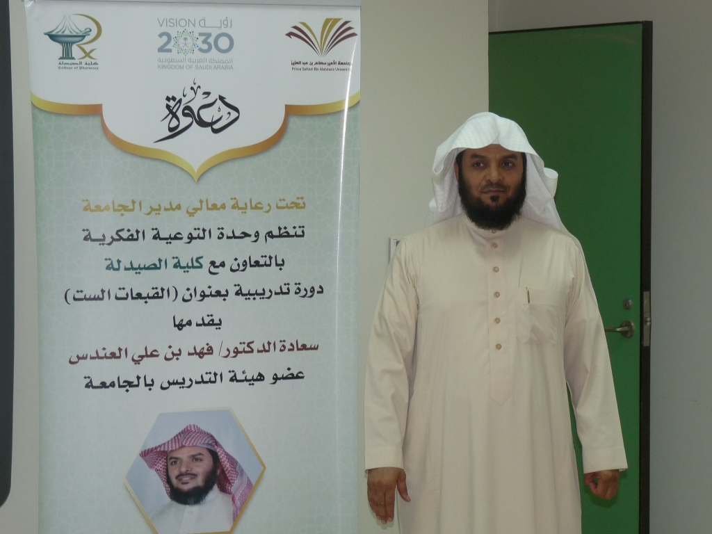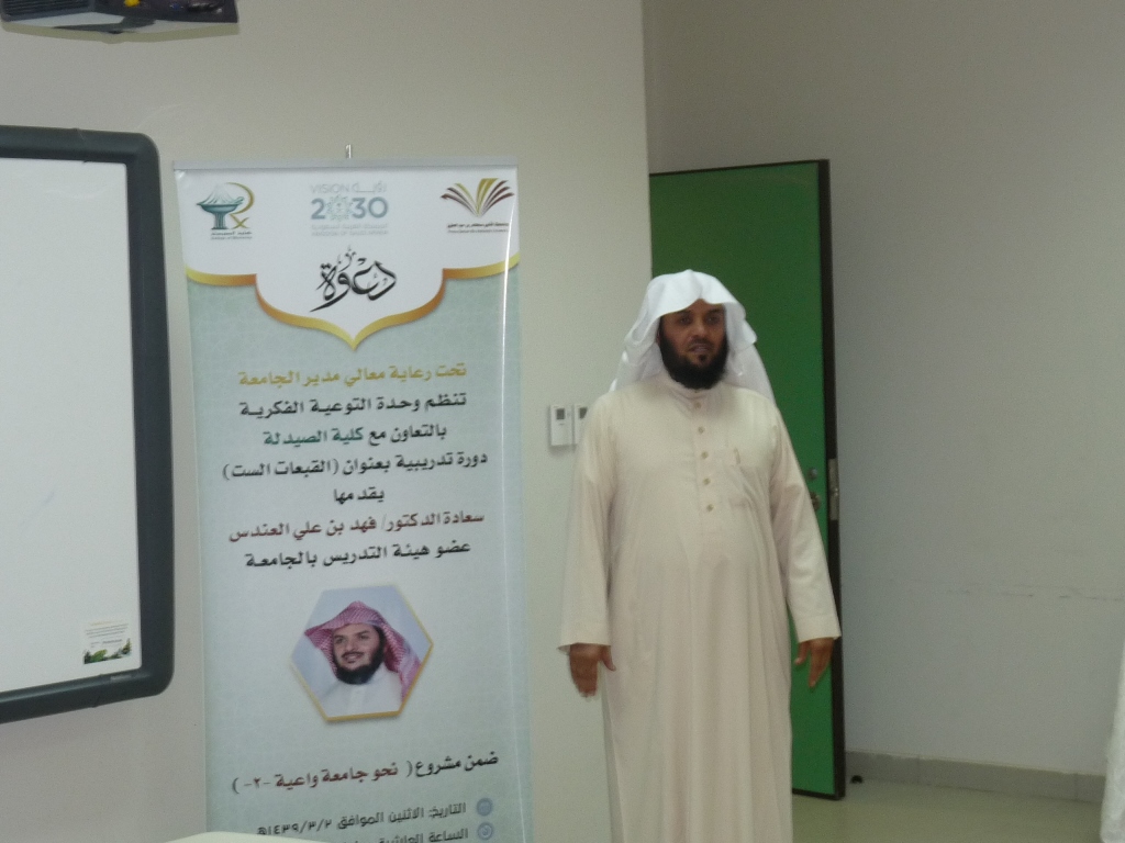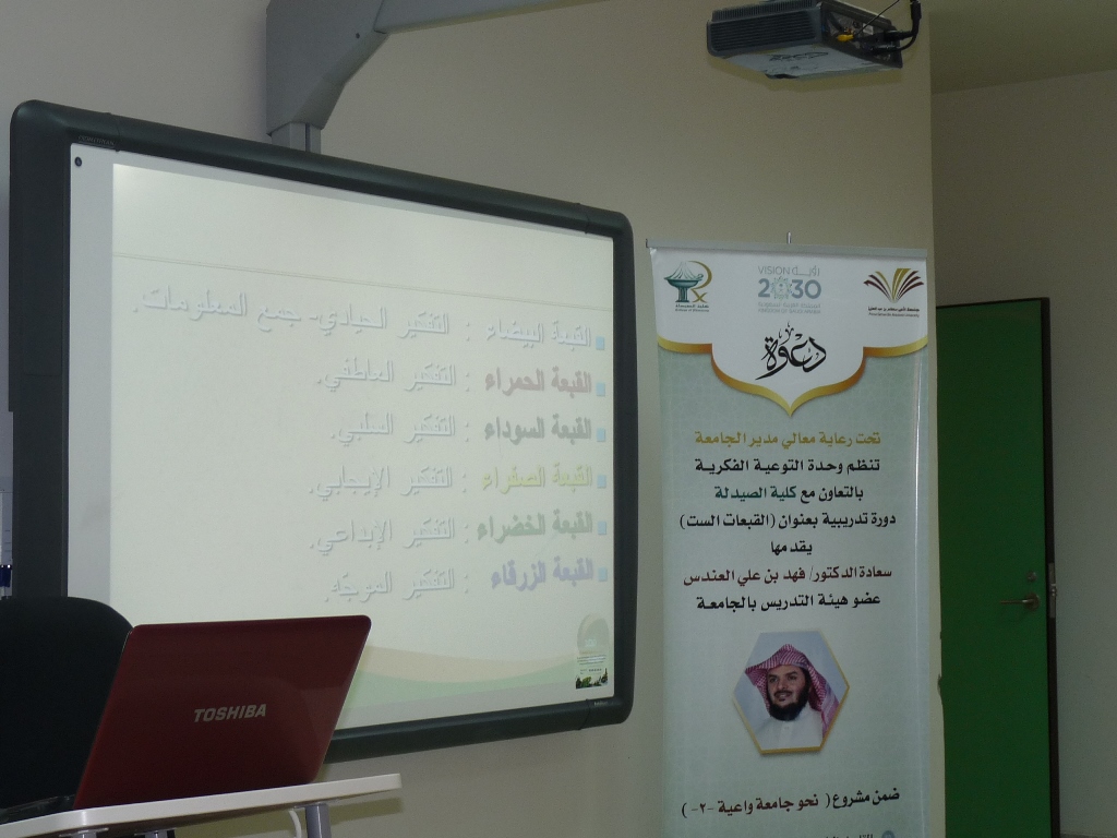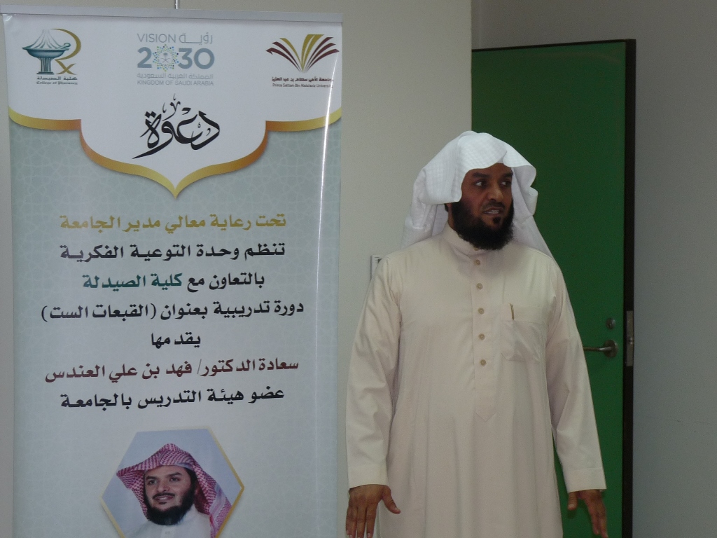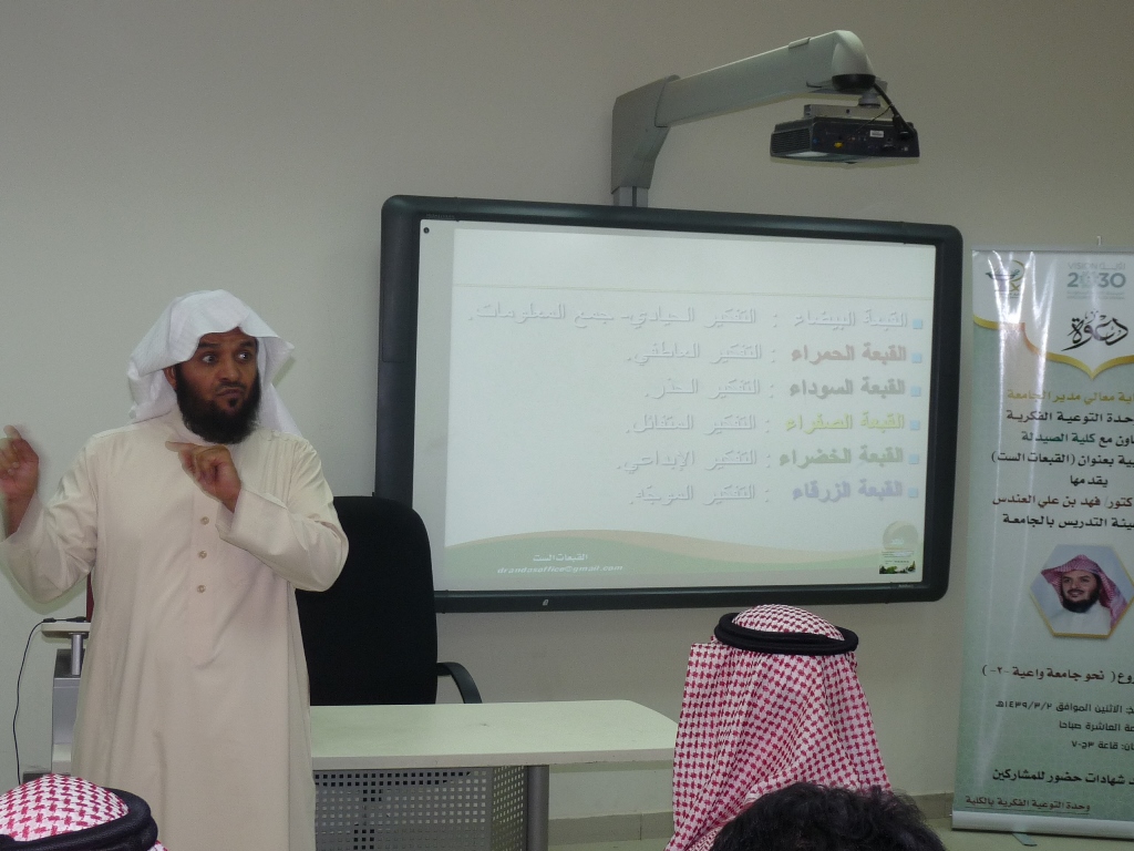 تحت رعاية معالي مدير الجامعة وبالتعاون مع وحدة التوعية الفكرية نظمت وحدة التوعية الفكرية بكلية الصيدلة - جامعة الأمير سطام بن عبدالعزيز ممثلة في سعادة عميد الكلية الدكتور فهد بن إبراهيم الصيخان ووكيل الكلية للشؤون التعليمية والأكاديمية الدكتور أحمد بن إبراهيم فوده الدكتور محمد بن حامد القرني رئيس لجنة التعليم الصيدلي المستمر ومنسق وحدة التوعية الفكرية بالكلية الدكتور عبدالرحيم محمد دنيا ضمن مشروع (نحو جامعة واعية-2-) محاضرة تحت عنوان (القبعات الست) لسعادة الدكتور فهد بن علي العندس "عضو هيئة التدريس بالجامعة " وذلك يوم الاثنين الموافق 2 / 3 / 1439هـ بتمام الساعة العاشرة صباحاً بقاعة 3 - ج - 7 . حيث تحدث سعادة الدكتور فهد بن علي العندس عن مصطلح القبعات الست وهي طرق التفكير المختلفة حيث تمثل القبعة البيضاء التفكير الحيادي المعتمد علي الارقام والاحصائيات وبها دائما يكون صاحبها ذو حجة قوية والقبعة الحمرا والتي يعتمد صاحبها علي العاطفة في التفكير واندفاعه ورائها، اما القبعة الثالثة فكانت السوداء وصاحبها دائما متشائم وحذر، ثم انتقل سعادة الي القبعة الرابعة وهي الصفراء وتضفي تأثير التفائل علي صاحبها، اما القبعة الخامسة فقد كانت الخضراء وهي معنية بالتفكير الابداعي وتحدث اخيرا عن القبعة الزرقاء وهي التي يتميز صاحبها بالتفكير الموجه. وقد حث سعادته الطلاب علي اتخاذ سبل التفكير المؤدية الي البناء و الابداع والابتعاد عن الطرق الهدامه المؤدية الي الفرقه. وفي نهاية المحاضرة كرم سعادة عميد كلية الصيدلة الدكتور فهد بن إبراهيم الصيخان الدكتور فهد بن علي العندس بشهادة شكر وتقدير نظير تلبيته الدعوة متمنين أن تستمر مثل هذه المحاضرات لما فيها من فوائد تعود بالنفع.
