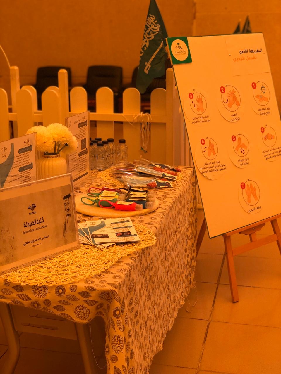 نظم المجلس الطلابي بكلية الصيدلة - قسم الطالبات فعالية تثقيفية تحت شعار “ معاً ضد كورونا المستجد “  ، وذلك يوم الأثنين الموافق 1/7/1441 هـ في ثانوية مدارس الجامعة  بحضور عدد من طالبات و منسوبات المدرسة  حيث تضمنت الفعالية عدة مجالات  منها   التعريف  بمرض كورنا المستجد و الفرق بينه وبين كورونا القديم و طرق انتقال العدوى و أعراض الإصابة به ، كما تم تقديم  نصائح وتوجيهات بخصوص كيفية الوقاية منه حيث تم عرض لوحة تعريفيه عن الطريقة الصحيحة لغسل اليدين  وتوزيع بروشورات توعوية وكيس يحتوي على وسائل الحماية من الأمراض المعدية كالصابون المطهر وكمامة وديتول وجل مسح للأيدي. ختاماً لقيت الفعالية استحسانا من إدارة المدرسة حيث تم عرض فيديو يوضح به أهمية تعقيم اليدين و أيضاً تم الاجابة على الاشاعات الغير صحيحة بخصوص هذا المرض