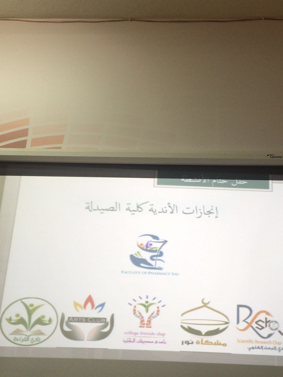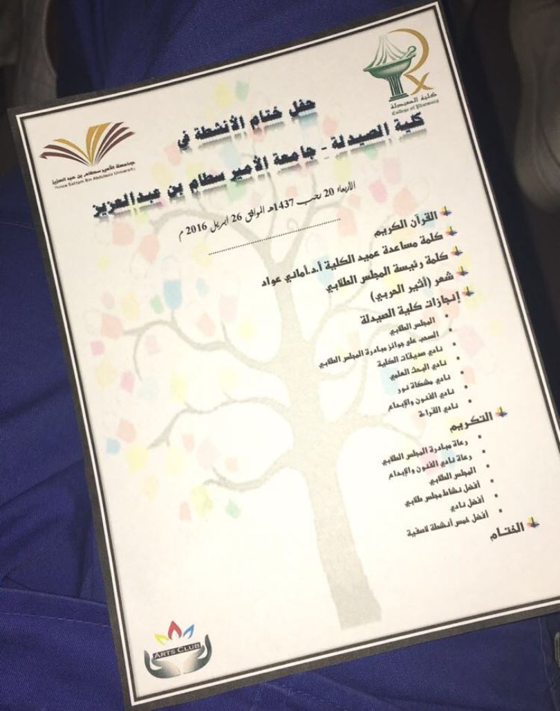 الحفل الختامي لـ أنشطه كليه الصيدله شطر الطالبات لعام ١٤٣٦-١٤٣٧ حيث أبتداء الحفل بايآت من القرآن الكريم تلتها الطالبه؛مريم الغامدي .ثم تلتها كلمة مساعدة العميد لشطر الطالبات الأستاذة الدكتوره اماني عواد حيث قالت ان هذا اليوم هو حصاد عام كامل وأن ما وصل إليه طالباتنا من إنجازات هو فخر لجامعه سطام