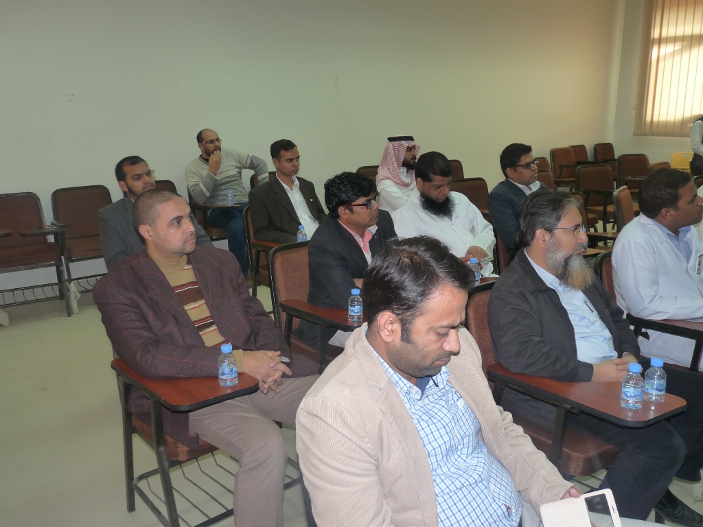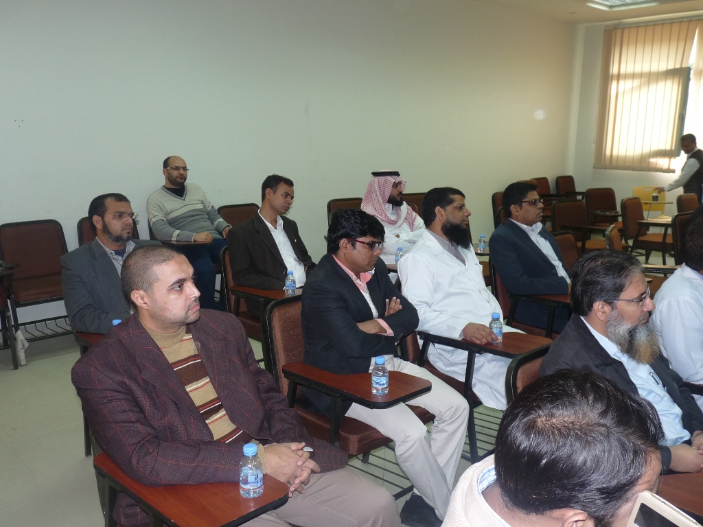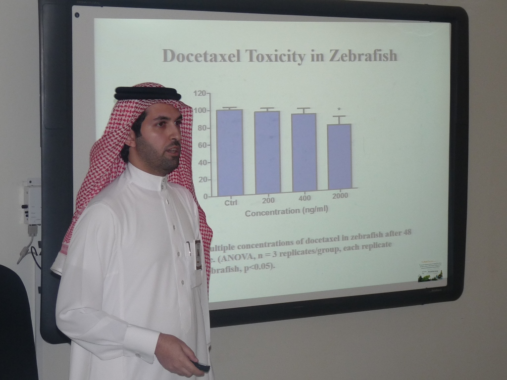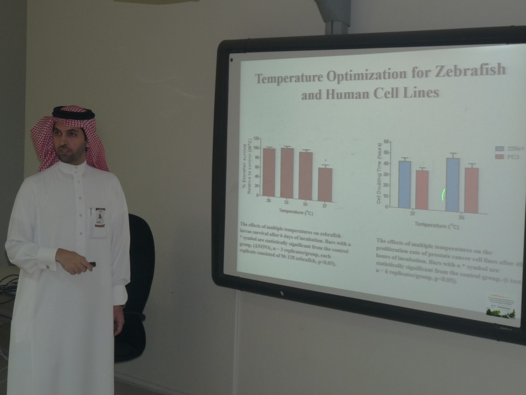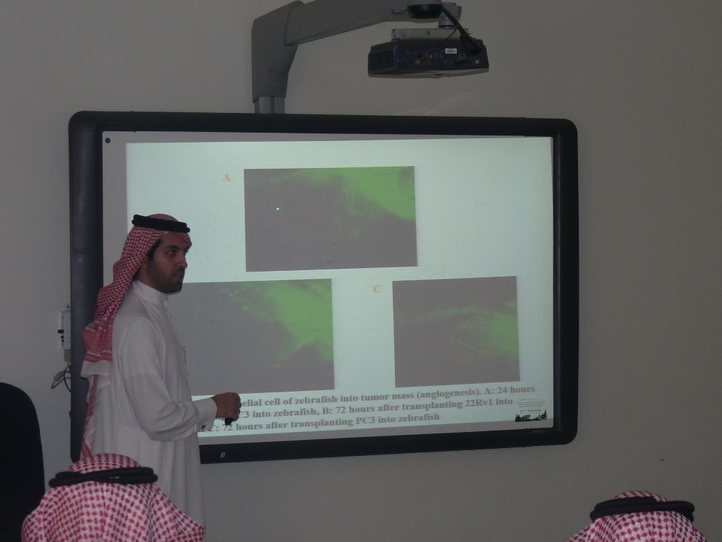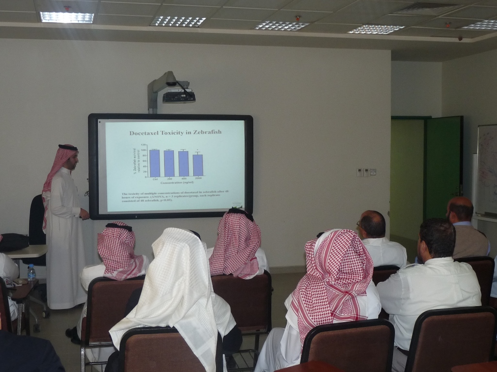 تحت رعاية عميد الكلية الدكتور فهد بن إبراهيم الصيخان أقامت الكلية محاضرة بعنوان: (مستخلص الزعفران ومركباته الفعالة كمواد مانعة و/أو معالجة لسرطان البروستاتا باستخدام نماذج الخلايا المخبرية والحيوانية ) والتي ألقاها الدكتور/ فيصل بن فايح البقمي الأستاذ المساعد بقسم علم الأدوية، وذلك يوم الثلاثاء 29/2/1438هـ الموافق 29/11/2016م الساعة الثانية عشر ظهراً، حيث كانت المحاضرة عن استخدام نماذج مختلفة في هذه الدراسة والتي تتضمن الخلايا البشرية التي تم تنميتها مخبرياً وكذلك نموذج حيواني لدراسة طريقة فعالية مستخلص الزعفران ومركباته. كما أثبتت فعالية خلاصة الزعفران ومركباته كعلاج وكمانع لحدوث سرطان البروستاتا. فهذه الدراسة طورت طريقة تحليلية باستخدام الكروماتوجرافيا ذات الضغط العالي لتقييم نوعية عينات الزعفران. للتغلب على محدودية مميزات نماذج الحيوانات الثدية المستخدمة حالياً، فقد تم تطوير نموذج حيواني باستزراع سرطان البروستاتا البشري في اسماك الزيبرافيش كبديل جديد. كما أن الزيبرافيش المعدلة جينياً اثبتت فعاليتها كنموذج حيواني يقلل الوقت اللازم في التقييمات قبل السريرية للأدوية الجديدة، كما انها وفرت إمكانية تخصيص دواء معين من خيارات العلاج المتاحة بناءً على حالة كل مريض بشكل خاص. وكان ذلك في الفصل الدراسي الأول للعام الجامعي 1437/1438هـ.