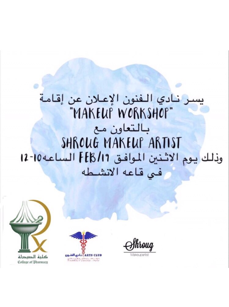 ضمن الأنشطة الطلابية نظم نادي الفنون بكلية الصيدلة شطر الطالبات فعاليتين حيث كانت الفعالية الأولى عبارة عن ورشة عمل عن أساسيات وضع المكياج للبشرة وذلك يوم الأثنين الموافق 26/5/1439ه في قاعة الأنشطة